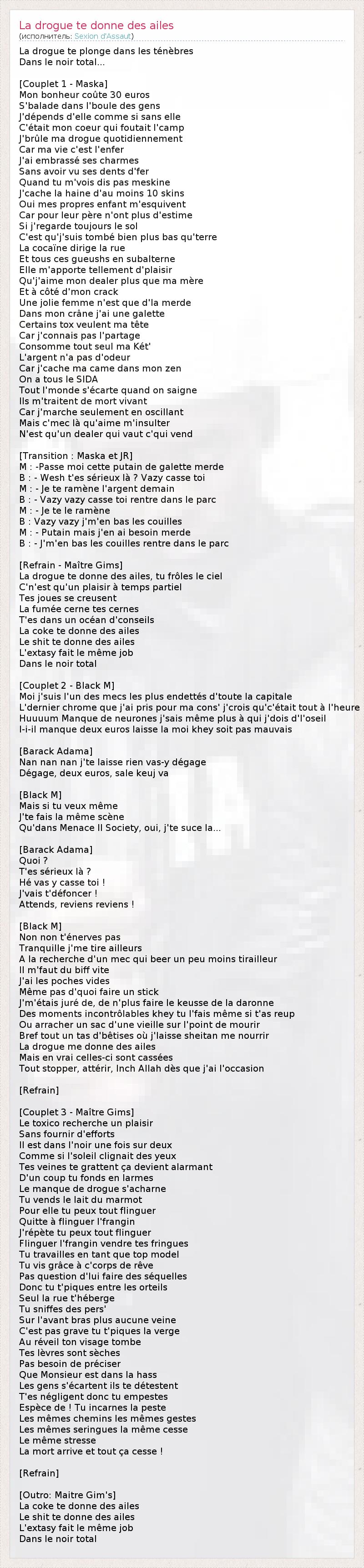 La drogue te plonge dans les ténèbres Dans le noir total... [Couplet 1 - Maska] Mon bonheur coûte 30 euros S'balade dans l'boule des gens J'dépends d'elle comme si sans elle C'était mon coeur qui foutait l'camp J'brûle ma drogue quotidiennement Car ma vie c'est l'enfer J'ai embrassé ses charmes Sans avoir vu ses dents d'fer Quand tu m'vois dis pas meskine J'cache la haine d'au moins 10 skins Oui mes propres enfant m'esquivent Car pour leur père n'ont plus d'estime Si j'regarde toujours le sol C'est qu'j'suis tombé bien plus bas qu'terre La cocaïne dirige la rue Et tous ces gueushs en subalterne Elle m'apporte tellement d'plaisir Qu'j'aime mon dealer plus que ma mère Et à côté d'mon crack Une jolie femme n'est que d'la merde Dans mon crâne j'ai une galette Certains tox veulent ma tête Car j'connais pas l'partage Consomme tout seul ma Két' L'argent n'a pas d'odeur Car j'cache ma came dans mon zen On a tous le SIDA Tout l'monde s'écarte quand on saigne Ils m'traitent de mort vivant Car j'marche seulement en oscillant Mais c'mec là qu'aime m'insulter N'est qu'un dealer qui vaut c'qui vend [Transition : Maska et JR] M : -Passe moi cette putain de galette merde B : - Wesh t'es sérieux là ? Vazy casse toi M : - Je te ramène l'argent demain B : - Vazy vazy casse toi rentre dans le parc M : - Je te le ramène B : Vazy vazy j'm'en bas les couilles M : - Putain mais j'en ai besoin merde B : - J'm'en bas les couilles rentre dans le parc [Refrain - Maître Gims] La drogue te donne des ailes, tu frôles le ciel C'n'est qu'un plaisir à temps partiel Tes joues se creusent La fumée cerne tes cernes T'es dans un océan d'conseils La coke te donne des ailes Le shit te donne des ailes L'extasy fait le même job Dans le noir total [Couplet 2 - Black M] Moi j'suis l'un des mecs les plus endettés d'toute la capitale L'dernier chrome que j'ai pris pour ma cons' j'crois qu'c'était tout à l'heure Huuuum Manque de neurones j'sais même plus à qui j'dois d'l'oseil I-i-il manque deux euros laisse la moi khey soit pas mauvais [Barack Adama] Nan nan nan j'te laisse rien vas-y dégage Dégage, deux euros, sale keuj va [Black M] Mais si tu veux même J'te fais la même scène Qu'dans Menace II Society, oui, j'te suce la... [Barack Adama] Quoi ? T'es sérieux là ? Hé vas y casse toi ! J'vais t'défoncer ! Attends, reviens reviens ! [Black M] Non non t'énerves pas Tranquille j'me tire ailleurs A la recherche d'un mec qui beer un peu moins tirailleur Il m'faut du biff vite J'ai les poches vides Même pas d'quoi faire un stick J'm'étais juré de, de n'plus faire le keusse de la daronne Des moments incontrôlables khey tu l'fais même si t'as reup Ou arracher un sac d'une vieille sur l'point de mourir Bref tout un tas d'bêtises où j'laisse sheitan me nourrir La drogue me donne des ailes Mais en vrai celles-ci sont cassées Tout stopper, attérir, Inch Allah dès que j'ai l'occasion [Refrain] [Couplet 3 - Maître Gims] Le toxico recherche un plaisir Sans fournir d'efforts Il est dans l'noir une fois sur deux Comme si l'soleil clignait des yeux Tes veines te grattent ça devient alarmant D'un coup tu fonds en larmes Le manque de drogue s'acharne Tu vends le lait du marmot Pour elle tu peux tout flinguer Quitte à flinguer l'frangin J'répète tu peux tout flinguer Flinguer l'frangin vendre tes fringues Tu travailles en tant que top model Tu vis grâce à c'corps de rêve Pas question d'lui faire des séquelles Donc tu t'piques entre les orteils Seul la rue t'héberge Tu sniffes des pers' Sur l'avant bras plus aucune veine C'est pas grave tu t'piques la verge Au réveil ton visage tombe Tes lèvres sont sèches Pas besoin de préciser Que Monsieur est dans la hass Les gens s'écartent ils te détestent T'es négligent donc tu empestes Espèce de ! Tu incarnes la peste Les mêmes chemins les mêmes gestes Les mêmes seringues la même cesse Le même stresse La mort arrive et tout ça cesse ! [Refrain] [Outro: Maitre Gim's] La coke te donne des ailes Le shit te donne des ailes L'extasy fait le même job Dans le noir total
