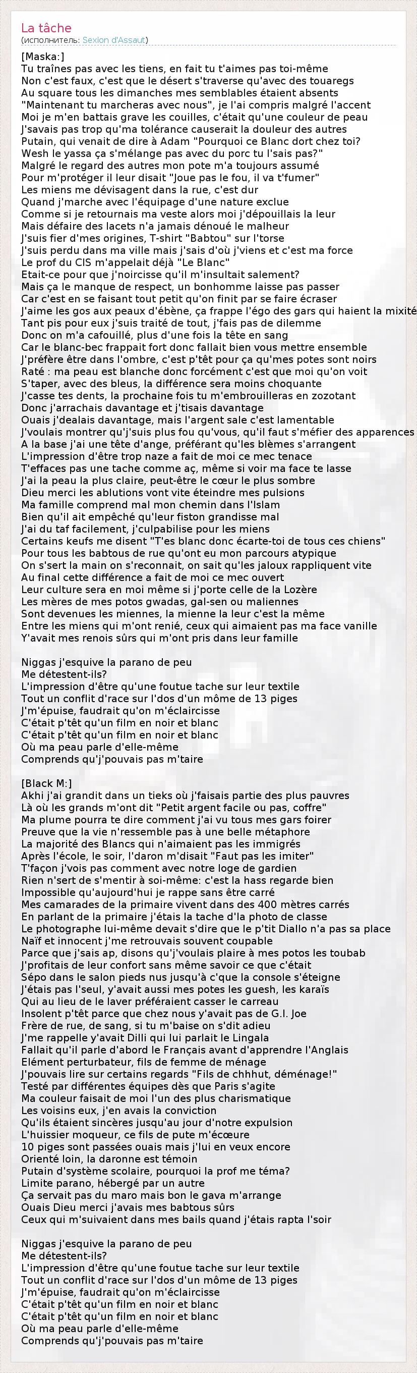 [Maska:] Tu traînes pas avec les tiens, en fait tu t'aimes pas toi-même Non c'est faux, c'est que le désert s'traverse qu'avec des touaregs Au square tous les dimanches mes semblables étaient absents "Maintenant tu marcheras avec nous", je l'ai compris malgré l'accent Moi je m'en battais grave les couilles, c'était qu'une couleur de peau J'savais pas trop qu'ma tolérance causerait la douleur des autres Putain, qui venait de dire à Adam "Pourquoi ce Blanc dort chez toi? Wesh le yassa ça s'mélange pas avec du porc tu l'sais pas?" Malgré le regard des autres mon pote m'a toujours assumé Pour m'protéger il leur disait "Joue pas le fou, il va t'fumer" Les miens me dévisagent dans la rue, c'est dur Quand j'marche avec l'équipage d'une nature exclue Comme si je retournais ma veste alors moi j'dépouillais la leur Mais défaire des lacets n'a jamais dénoué le malheur J'suis fier d'mes origines, T-shirt "Babtou" sur l'torse J'suis perdu dans ma ville mais j'sais d'où j'viens et c'est ma force Le prof du CIS m'appelait déjà "Le Blanc" Etait-ce pour que j'noircisse qu'il m'insultait salement? Mais ça le manque de respect, un bonhomme laisse pas passer Car c'est en se faisant tout petit qu'on finit par se faire écraser J'aime les gos aux peaux d'ébène, ça frappe l'égo des gars qui haient la mixité Tant pis pour eux j'suis traité de tout, j'fais pas de dilemme Donc on m'a cafouillé, plus d'une fois la tête en sang Car le blanc-bec frappait fort donc fallait bien vous mettre ensemble J'préfère être dans l'ombre, c'est p'têt pour ça qu'mes potes sont noirs Raté : ma peau est blanche donc forcément c'est que moi qu'on voit S'taper, avec des bleus, la différence sera moins choquante J'casse tes dents, la prochaine fois tu m'embrouilleras en zozotant Donc j'arrachais davantage et j'tisais davantage Ouais j'dealais davantage, mais l'argent sale c'est lamentable J'voulais montrer qu'j'suis plus fou qu'vous, qu'il faut s'méfier des apparences A la base j'ai une tête d'ange, préférant qu'les blèmes s'arrangent L'impression d'être trop naze a fait de moi ce mec tenace T'effaces pas une tache comme aç, même si voir ma face te lasse J'ai la peau la plus claire, peut-être le cœur le plus sombre Dieu merci les ablutions vont vite éteindre mes pulsions Ma famille comprend mal mon chemin dans l'Islam Bien qu'il ait empêché qu'leur fiston grandisse mal J'ai du taf facilement, j'culpabilise pour les miens Certains keufs me disent "T'es blanc donc écarte-toi de tous ces chiens" Pour tous les babtous de rue qu'ont eu mon parcours atypique On s'sert la main on s'reconnait, on sait qu'les jaloux rappliquent vite Au final cette différence a fait de moi ce mec ouvert Leur culture sera en moi même si j'porte celle de la Lozère Les mères de mes potos gwadas, gal-sen ou maliennes Sont devenues les miennes, la mienne la leur c'est la même Entre les miens qui m'ont renié, ceux qui aimaient pas ma face vanille Y'avait mes renois sûrs qui m'ont pris dans leur famille Niggas j'esquive la parano de peu Me détestent-ils? L'impression d'être qu'une foutue tache sur leur textile Tout un conflit d'race sur l'dos d'un môme de 13 piges J'm'épuise, faudrait qu'on m'éclaircisse C'était p'têt qu'un film en noir et blanc C'était p'têt qu'un film en noir et blanc Où ma peau parle d'elle-même Comprends qu'j'pouvais pas m'taire [Black M:] Akhi j'ai grandit dans un tieks où j'faisais partie des plus pauvres Là où les grands m'ont dit "Petit argent facile ou pas, coffre" Ma plume pourra te dire comment j'ai vu tous mes gars foirer Preuve que la vie n'ressemble pas à une belle métaphore La majorité des Blancs qui n'aimaient pas les immigrés Après l'école, le soir, l'daron m'disait "Faut pas les imiter" T'façon j'vois pas comment avec notre loge de gardien Rien n'sert de s'mentir à soi-même: c'est la hass regarde bien Impossible qu'aujourd'hui je rappe sans être carré Mes camarades de la primaire vivent dans des 400 mètres carrés En parlant de la primaire j'étais la tache d'la photo de classe Le photographe lui-même devait s'dire que le p'tit Diallo n'a pas sa place Naïf et innocent j'me retrouvais souvent coupable Parce que j'sais ap, disons qu'j'voulais plaire à mes potos les toubab J'profitais de leur confort sans même savoir ce que c'était Sépo dans le salon pieds nus jusqu'à c'que la console s'éteigne J'étais pas l'seul, y'avait aussi mes potes les guesh, les karaïs Qui au lieu de le laver préféraient casser le carreau Insolent p'têt parce que chez nous y'avait pas de G.I. Joe Frère de rue, de sang, si tu m'baise on s'dit adieu J'me rappelle y'avait Dilli qui lui parlait le Lingala Fallait qu'il parle d'abord le Français avant d'apprendre l'Anglais Elément perturbateur, fils de femme de ménage J'pouvais lire sur certains regards "Fils de chhhut, déménage!" Testé par différentes équipes dès que Paris s'agite Ma couleur faisait de moi l'un des plus charismatique Les voisins eux, j'en avais la conviction Qu'ils étaient sincères jusqu'au jour d'notre expulsion L'huissier moqueur, ce fils de pute m'écœure 10 piges sont passées ouais mais j'lui en veux encore Orienté loin, la daronne est témoin Putain d'système scolaire, pourquoi la prof me téma? Limite parano, hébergé par un autre Ça servait pas du maro mais bon le gava m'arrange Ouais Dieu merci j'avais mes babtous sûrs Ceux qui m'suivaient dans mes bails quand j'étais rapta l'soir Niggas j'esquive la parano de peu Me détestent-ils? L'impression d'être qu'une foutue tache sur leur textile Tout un conflit d'race sur l'dos d'un môme de 13 piges J'm'épuise, faudrait qu'on m'éclaircisse C'était p'têt qu'un film en noir et blanc C'était p'têt qu'un film en noir et blanc Où ma peau parle d'elle-même Comprends qu'j'pouvais pas m'taire