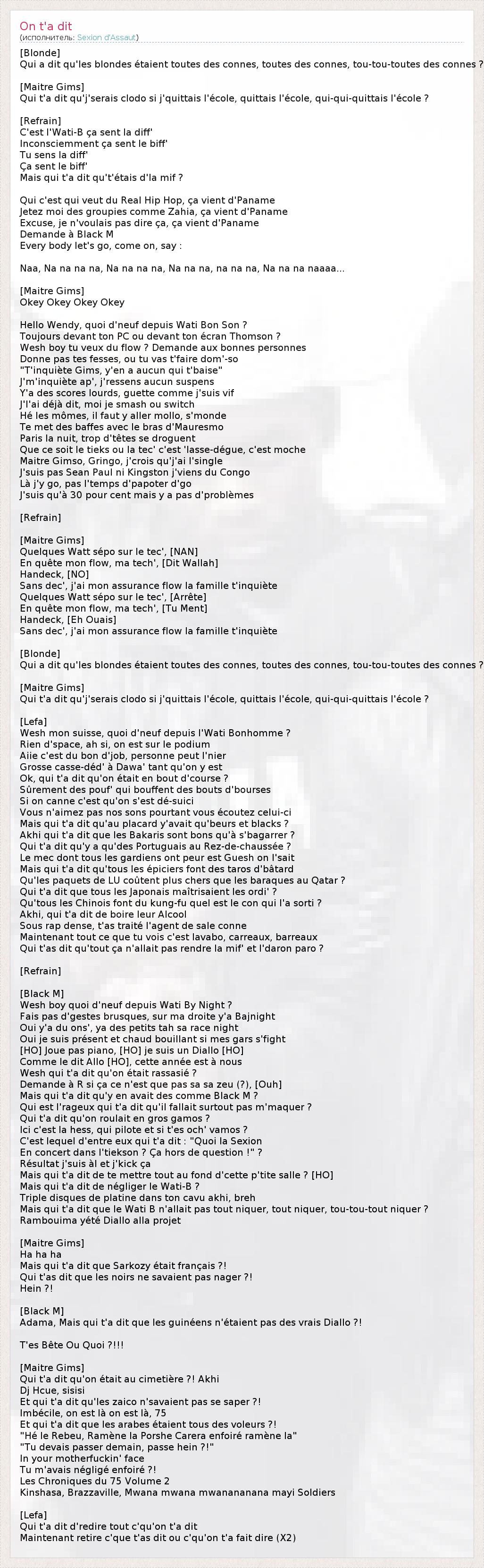 [Blonde] Qui a dit qu'les blondes étaient toutes des connes, toutes des connes, tou-tou-toutes des connes ? [Maitre Gims] Qui t'a dit qu'j'serais clodo si j'quittais l'école, quittais l'école, qui-qui-quittais l'école ? [Refrain] C'est l'Wati-B ça sent la diff' Inconsciemment ça sent le biff' Tu sens la diff' Ça sent le biff' Mais qui t'a dit qu't'étais d'la mif ? Qui c'est qui veut du Real Hip Hop, ça vient d'Paname Jetez moi des groupies comme Zahia, ça vient d'Paname Excuse, je n'voulais pas dire ça, ça vient d'Paname Demande à Black M Every body let's go, come on, say : Naa, Na na na na, Na na na na, Na na na, na na na, Na na na naaaa... [Maitre Gims] Okey Okey Okey Okey Hello Wendy, quoi d'neuf depuis Wati Bon Son ? Toujours devant ton PC ou devant ton écran Thomson ? Wesh boy tu veux du flow ? Demande aux bonnes personnes Donne pas tes fesses, ou tu vas t'faire dom'-so "T'inquiète Gims, y'en a aucun qui t'baise" J'm'inquiète ap', j'ressens aucun suspens Y'a des scores lourds, guette comme j'suis vif J'l'ai déjà dit, moi je smash ou switch Hé les mômes, il faut y aller mollo, s'monde Te met des baffes avec le bras d'Mauresmo Paris la nuit, trop d'têtes se droguent Que ce soit le tieks ou la tec' c'est 'lasse-dégue, c'est moche Maitre Gimso, Gringo, j'crois qu'j'ai l'single J'suis pas Sean Paul ni Kingston j'viens du Congo Là j'y go, pas l'temps d'papoter d'go J'suis qu'à 30 pour cent mais y a pas d'problèmes [Refrain] [Maitre Gims] Quelques Watt sépo sur le tec', [NAN] En quête mon flow, ma tech', [Dit Wallah] Handeck, [NO] Sans dec', j'ai mon assurance flow la famille t'inquiète Quelques Watt sépo sur le tec', [Arrête] En quête mon flow, ma tech', [Tu Ment] Handeck, [Eh Ouais] Sans dec', j'ai mon assurance flow la famille t'inquiète [Blonde] Qui a dit qu'les blondes étaient toutes des connes, toutes des connes, tou-tou-toutes des connes ? [Maitre Gims] Qui t'a dit qu'j'serais clodo si j'quittais l'école, quittais l'école, qui-qui-quittais l'école ? [Lefa] Wesh mon suisse, quoi d'neuf depuis l'Wati Bonhomme ? Rien d'space, ah si, on est sur le podium Aiie c'est du bon d'job, personne peut l'nier Grosse casse-déd' à Dawa' tant qu'on y est Ok, qui t'a dit qu'on était en bout d'course ? Sûrement des pouf' qui bouffent des bouts d'bourses Si on canne c'est qu'on s'est dé-suici Vous n'aimez pas nos sons pourtant vous écoutez celui-ci Mais qui t'a dit qu'au placard y'avait qu'beurs et blacks ? Akhi qui t'a dit que les Bakaris sont bons qu'à s'bagarrer ? Qui t'a dit qu'y a qu'des Portuguais au Rez-de-chaussée ? Le mec dont tous les gardiens ont peur est Guesh on l'sait Mais qui t'a dit qu'tous les épiciers font des taros d'bâtard Qu'les paquets de LU coûtent plus chers que les baraques au Qatar ? Qui t'a dit que tous les Japonais maîtrisaient les ordi' ? Qu'tous les Chinois font du kung-fu quel est le con qui l'a sorti ? Akhi, qui t'a dit de boire leur Alcool Sous rap dense, t'as traité l'agent de sale conne Maintenant tout ce que tu vois c'est lavabo, carreaux, barreaux Qui t'as dit qu'tout ça n'allait pas rendre la mif' et l'daron paro ? [Refrain] [Black M] Wesh boy quoi d'neuf depuis Wati By Night ? Fais pas d'gestes brusques, sur ma droite y'a Bajnight Oui y'a du ons', ya des petits tah sa race night Oui je suis présent et chaud bouillant si mes gars s'fight [HO] Joue pas piano, [HO] je suis un Diallo [HO] Comme le dit Allo [HO], cette année est à nous Wesh qui t'a dit qu'on était rassasié ? Demande à R si ça ce n'est que pas sa sa zeu (?), [Ouh] Mais qui t'a dit qu'y en avait des comme Black M ? Qui est l'rageux qui t'a dit qu'il fallait surtout pas m'maquer ? Qui t'a dit qu'on roulait en gros gamos ? Ici c'est la hess, qui pilote et si t'es och' vamos ? C'est lequel d'entre eux qui t'a dit : "Quoi la Sexion En concert dans l'tiekson ? Ça hors de question !" ? Résultat j'suis àl et j'kick ça Mais qui t'a dit de te mettre tout au fond d'cette p'tite salle ? [HO] Mais qui t'a dit de négliger le Wati-B ? Triple disques de platine dans ton cavu akhi, breh Mais qui t'a dit que le Wati B n'allait pas tout niquer, tout niquer, tou-tou-tout niquer ? Rambouima yété Diallo alla projet [Maitre Gims] Ha ha ha Mais qui t'a dit que Sarkozy était français ?! Qui t'as dit que les noirs ne savaient pas nager ?! Hein ?! [Black M] Adama, Mais qui t'a dit que les guinéens n'étaient pas des vrais Diallo ?! T'es Bête Ou Quoi ?!!! [Maitre Gims] Qui t'a dit qu'on était au cimetière ?! Akhi Dj Hcue, sisisi Et qui t'a dit qu'les zaico n'savaient pas se saper ?! Imbécile, on est là on est là, 75 Et qui t'a dit que les arabes étaient tous des voleurs ?! "Hé le Rebeu, Ramène la Porshe Carera enfoiré ramène la" "Tu devais passer demain, passe hein ?!" In your motherfuckin' face Tu m'avais négligé enfoiré ?! Les Chroniques du 75 Volume 2 Kinshasa, Brazzaville, Mwana mwana mwanananana mayi Soldiers [Lefa] Qui t'a dit d'redire tout c'qu'on t'a dit Maintenant retire c'que t'as dit ou c'qu'on t'a fait dire (X2)