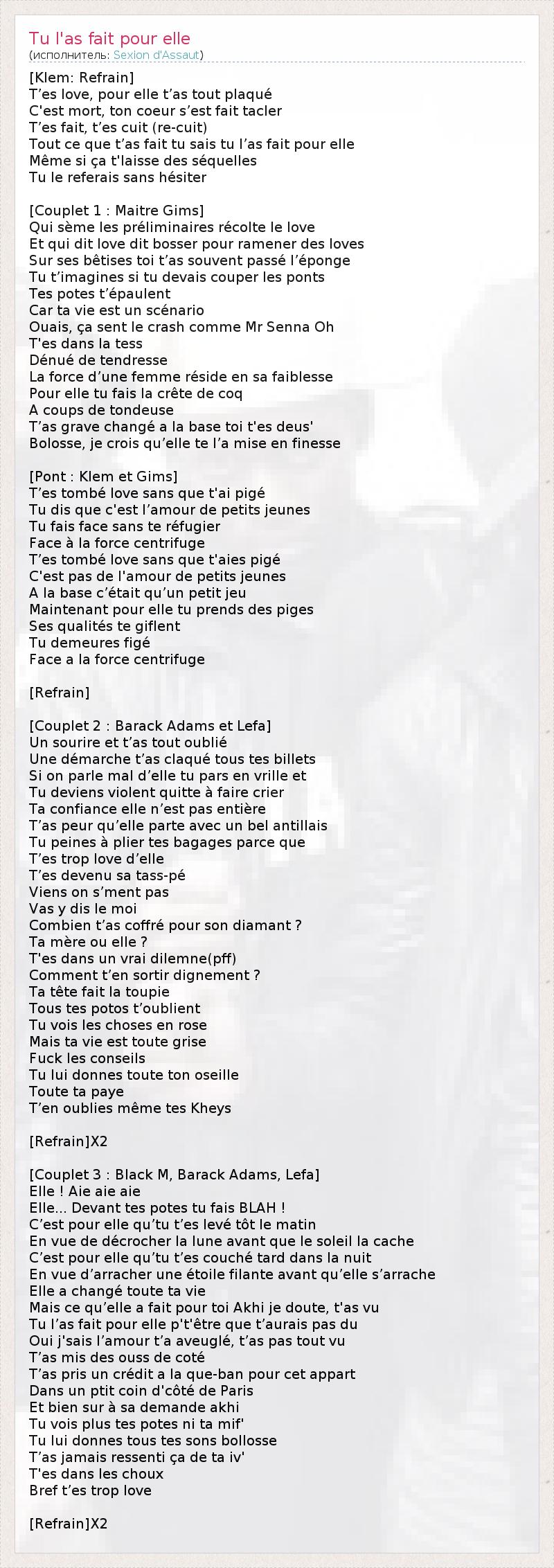 [Klem: Refrain] T’es love, pour elle t’as tout plaqué C'est mort, ton coeur s’est fait tacler T’es fait, t’es cuit (re-cuit) Tout ce que t’as fait tu sais tu l’as fait pour elle Même si ça t'laisse des séquelles Tu le referais sans hésiter [Couplet 1 : Maitre Gims] Qui sème les préliminaires récolte le love Et qui dit love dit bosser pour ramener des loves Sur ses bêtises toi t’as souvent passé l’éponge Tu t’imagines si tu devais couper les ponts Tes potes t’épaulent Car ta vie est un scénario Ouais, ça sent le crash comme Mr Senna Oh T'es dans la tess Dénué de tendresse La force d’une femme réside en sa faiblesse Pour elle tu fais la crête de coq A coups de tondeuse T’as grave changé a la base toi t'es deus' Bolosse, je crois qu’elle te l’a mise en finesse [Pont : Klem et Gims] T’es tombé love sans que t'ai pigé Tu dis que c'est l’amour de petits jeunes Tu fais face sans te réfugier Face à la force centrifuge T’es tombé love sans que t'aies pigé C'est pas de l'amour de petits jeunes A la base c’était qu’un petit jeu Maintenant pour elle tu prends des piges Ses qualités te giflent Tu demeures figé Face a la force centrifuge [Refrain] [Couplet 2 : Barack Adams et Lefa] Un sourire et t’as tout oublié Une démarche t’as claqué tous tes billets Si on parle mal d’elle tu pars en vrille et Tu deviens violent quitte à faire crier Ta confiance elle n’est pas entière T’as peur qu’elle parte avec un bel antillais Tu peines à plier tes bagages parce que T’es trop love d’elle T’es devenu sa tass-pé Viens on s’ment pas Vas y dis le moi Combien t’as coffré pour son diamant ? Ta mère ou elle ? T'es dans un vrai dilemne(pff) Comment t’en sortir dignement ? Ta tête fait la toupie Tous tes potos t’oublient Tu vois les choses en rose Mais ta vie est toute grise Fuck les conseils Tu lui donnes toute ton oseille Toute ta paye T’en oublies même tes Kheys [Refrain]X2 [Couplet 3 : Black M, Barack Adams, Lefa] Elle ! Aie aie aie Elle... Devant tes potes tu fais BLAH ! C’est pour elle qu’tu t’es levé tôt le matin En vue de décrocher la lune avant que le soleil la cache C’est pour elle qu’tu t’es couché tard dans la nuit En vue d’arracher une étoile filante avant qu’elle s’arrache Elle a changé toute ta vie Mais ce qu’elle a fait pour toi Akhi je doute, t'as vu Tu l’as fait pour elle p't'être que t’aurais pas du Oui j'sais l’amour t’a aveuglé, t’as pas tout vu T’as mis des ouss de coté T’as pris un crédit a la que-ban pour cet appart Dans un ptit coin d'côté de Paris Et bien sur à sa demande akhi Tu vois plus tes potes ni ta mif' Tu lui donnes tous tes sons bollosse T’as jamais ressenti ça de ta iv' T'es dans les choux Bref t’es trop love [Refrain]X2