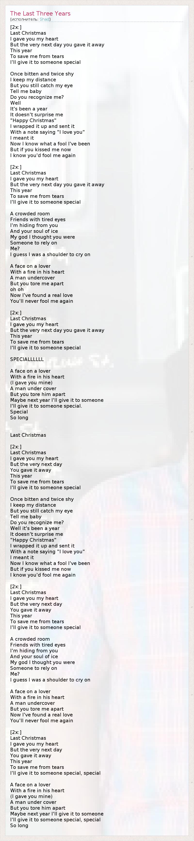 [2x:] Last Christmas I gave you my heart But the very next day you gave it away This year To save me from tears I'll give it to someone special Once bitten and twice shy I keep my distance But you still catch my eye Tell me baby Do you recognize me? Well It's been a year It doesn't surprise me "Happy Christmas" I wrapped it up and sent it With a note saying "I love you" I meant it Now I know what a fool I've been But if you kissed me now I know you'd fool me again [2x:] Last Christmas I gave you my heart But the very next day you gave it away This year To save me from tears I'll give it to someone special A crowded room Friends with tired eyes I'm hiding from you And your soul of ice My god I thought you were Someone to rely on Me? I guess I was a shoulder to cry on A face on a lover With a fire in his heart A man undercover But you tore me apart oh oh Now I've found a real love You'll never fool me again [2x:] Last Christmas I gave you my heart But the very next day you gave it away This year To save me from tears I'll give it to someone special SPECIALLLLLL A face on a lover With a fire in his heart (I gave you mine) A man under cover But you tore him apart Maybe next year I'll give it to someone I'll give it to someone special. Special So long Last Christmas [2x:] Last Christmas I gave you my heart But the very next day You gave it away This year To save me from tears I'll give it to someone special Once bitten and twice shy I keep my distance But you still catch my eye Tell me baby Do you recognize me? Well it's been a year It doesn't surprise me "Happy Christmas" I wrapped it up and sent it With a note saying "I love you" I meant it Now I know what a fool I've been But if you kissed me now I know you'd fool me again [2x:] Last Christmas I gave you my heart But the very next day You gave it away This year To save me from tears I'll give it to someone special A crowded room Friends with tired eyes I'm hiding from you And your soul of ice My god I thought you were Someone to rely on Me? I guess I was a shoulder to cry on A face on a lover With a fire in his heart A man undercover But you tore me apart Now I've found a real love You'll never fool me again [2x:] Last Christmas I gave you my heart But the very next day You gave it away This year To save me from tears I'll give it to someone special, special A face on a lover With a fire in his heart (I gave you mine) A man under cover But you tore him apart Maybe next year I'll give it to someone I'll give it to someone special, special So long