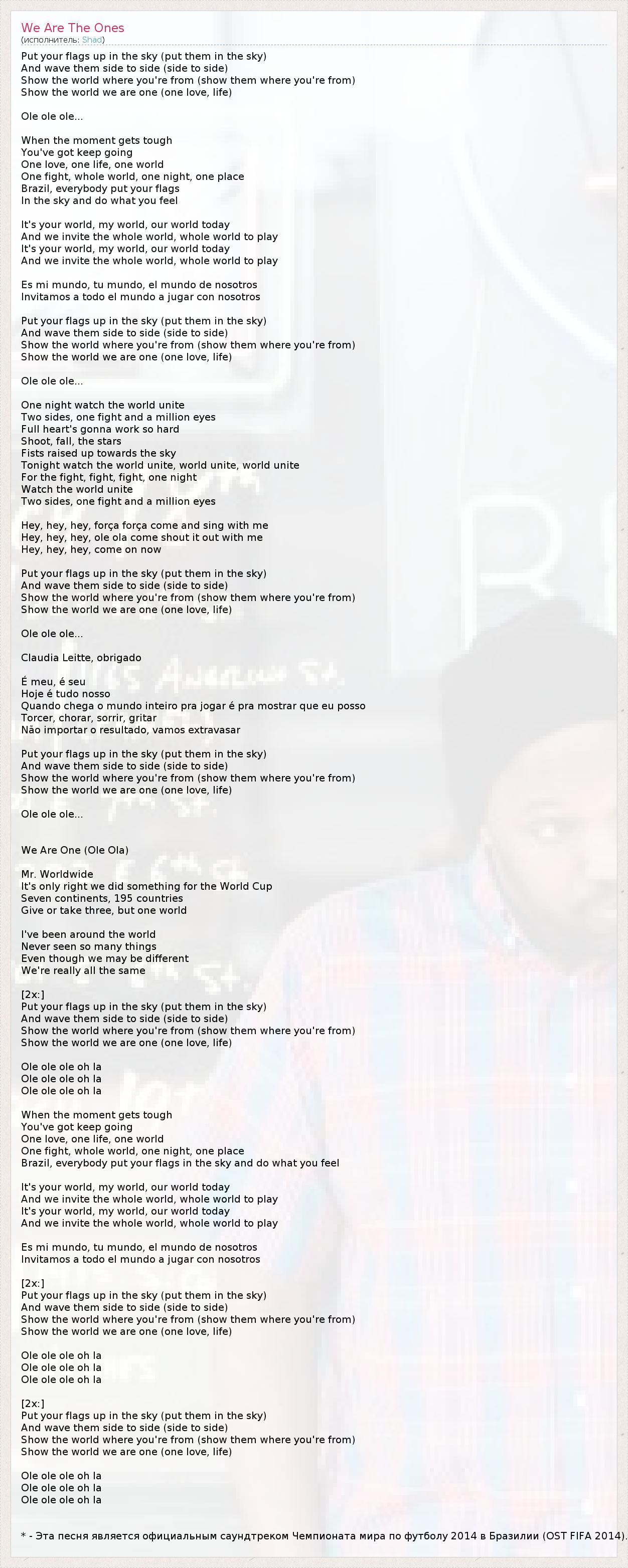 Put your flags up in the sky (put them in the sky) And wave them side to side (side to side) Show the world where you're from (show them where you're from) Show the world we are one (one love, life) Ole ole ole... When the moment gets tough You've got keep going One love, one life, one world One fight, whole world, one night, one place Brazil, everybody put your flags In the sky and do what you feel It's your world, my world, our world today And we invite the whole world, whole world to play It's your world, my world, our world today And we invite the whole world, whole world to play Es mi mundo, tu mundo, el mundo de nosotros Invitamos a todo el mundo a jugar con nosotros Put your flags up in the sky (put them in the sky) And wave them side to side (side to side) Show the world where you're from (show them where you're from) Show the world we are one (one love, life) Ole ole ole... One night watch the world unite Two sides, one fight and a million eyes Full heart's gonna work so hard Shoot, fall, the stars Fists raised up towards the sky Tonight watch the world unite, world unite, world unite For the fight, fight, fight, one night Watch the world unite Two sides, one fight and a million eyes Hey, hey, hey, força força come and sing with me Hey, hey, hey, ole ola come shout it out with me Hey, hey, hey, come on now Put your flags up in the sky (put them in the sky) And wave them side to side (side to side) Show the world where you're from (show them where you're from) Show the world we are one (one love, life) Ole ole ole... Claudia Leitte, obrigado É meu, é seu Hoje é tudo nosso Quando chega o mundo inteiro pra jogar é pra mostrar que eu posso Torcer, chorar, sorrir, gritar Não importar o resultado, vamos extravasar Put your flags up in the sky (put them in the sky) And wave them side to side (side to side) Show the world where you're from (show them where you're from) Show the world we are one (one love, life) Ole ole ole... We Are One (Ole Ola) Mr. Worldwide It's only right we did something for the World Cup Seven continents, 195 countries Give or take three, but one world I've been around the world Never seen so many things Even though we may be different We're really all the same [2x:] Put your flags up in the sky (put them in the sky) And wave them side to side (side to side) Show the world where you're from (show them where you're from) Show the world we are one (one love, life) Ole ole ole oh la Ole ole ole oh la Ole ole ole oh la When the moment gets tough You've got keep going One love, one life, one world One fight, whole world, one night, one place Brazil, everybody put your flags in the sky and do what you feel It's your world, my world, our world today And we invite the whole world, whole world to play It's your world, my world, our world today And we invite the whole world, whole world to play Es mi mundo, tu mundo, el mundo de nosotros Invitamos a todo el mundo a jugar con nosotros [2x:] Put your flags up in the sky (put them in the sky) And wave them side to side (side to side) Show the world where you're from (show them where you're from) Show the world we are one (one love, life) Ole ole ole oh la Ole ole ole oh la Ole ole ole oh la [2x:] Put your flags up in the sky (put them in the sky) And wave them side to side (side to side) Show the world where you're from (show them where you're from) Show the world we are one (one love, life) Ole ole ole oh la Ole ole ole oh la Ole ole ole oh la * - Эта песня является официальным саундтреком Чемпионата мира по футболу 2014 в Бразилии (OST FIFA 2014).