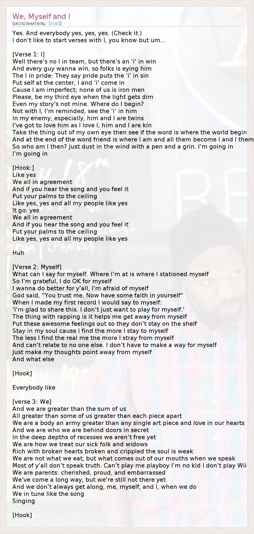 Yes. And everybody yes, yes, yes. (Check it.) I don't like to start verses with I, you know but um... [Verse 1: I] Well there's no I in team, but there's an 'i' in win And every guy wanna win, so folks is eying him The I in pride: They say pride puts the 'i' in sin Put self at the center, I and 'i' come in Cause I am imperfect; none of us is iron men Please, be my third eye when the light gets dim Even my story's not mine. Where do I begin? Not with I, I'm reminded, see the 'i' in him In my enemy, especially, him and I are twins I've got to love him as I love I, him and I are kin Take the thing out of my own eye then see if the word is where the world begin And at the end of the word friend is where I am and all them become I and I them So who am I then? Just dust in the wind with a pen and a grin. I'm going in I'm going in [Hook:] Like yes We all in agreement And if you hear the song and you feel it Put your palms to the ceiling Like yes, yes and all my people like yes It go: yes We all in agreement And if you hear the song and you feel it Put your palms to the ceiling Like yes, yes and all my people like yes Huh [Verse 2: Myself] What can I say for myself. Where I'm at is where I stationed myself So I'm grateful, I do OK for myself I wanna do better for y'all, I'm afraid of myself God said, "You trust me. Now have some faith in yourself" When I made my first record I would say to myself: 'I'm glad to share this. I don't just want to play for myself.' The thing with rapping is it helps me get away from myself Put these awesome feelings out so they don't stay on the shelf Stay in my soul cause I find the more I stay to myself The less I find the real me the more I stray from myself And can't relate to no one else. I don't have to make a way for myself Just make my thoughts point away from myself And what else [Hook] Everybody like [verse 3: We] And we are greater than the sum of us All greater than some of us greater than each piece apart We are a body an army greater than any single art piece and love in our hearts And we are who we are behind doors in secret In the deep depths of recesses we aren't free yet We are how we treat our sick folk and widows Rich with broken hearts broken and crippled the soul is weak We are not what we eat, but what comes out of our mouths when we speak Most of y'all don't speak truth. Can't play me playboy I'm no kid I don't play Wii We are parents: cherished, proud, and embarrassed We've come a long way, but we're still not there yet And we don't always get along, me, myself, and I, when we do We in tune like the song Singing [Hook]