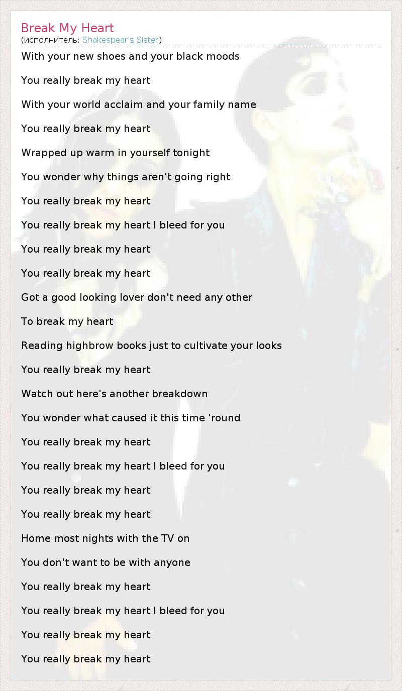 With your new shoes and your black moods You really break my heart With your world acclaim and your family name You really break my heart Wrapped up warm in yourself tonight You wonder why things aren't going right You really break my heart You really break my heart I bleed for you You really break my heart You really break my heart Got a good looking lover don't need any other To break my heart Reading highbrow books just to cultivate your looks You really break my heart Watch out here's another breakdown You wonder what caused it this time 'round You really break my heart You really break my heart I bleed for you You really break my heart You really break my heart Home most nights with the TV on You don't want to be with anyone You really break my heart You really break my heart I bleed for you You really break my heart You really break my heart