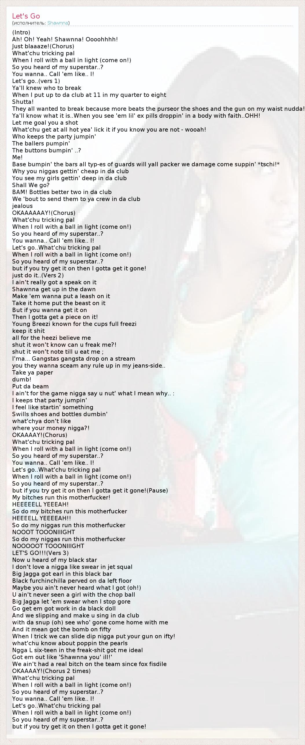 (Intro) Ah! Oh! Yeah! Shawnna! Oooohhhh! Just blaaaze!(Chorus) What'chu tricking pal When I roll with a ball in light (come on!) So you heard of my superstar..? You wanna.. Call 'em like.. I! Let's go..(vers 1) Ya'll knew who to break When I put up to da club at 11 in my quarter to eight Shutta! They all wanted to break because more beats the purseor the shoes and the gun on my waist nudda! Ya'll know what it is..When you see 'em lil' ex pills droppin' in a body with faith..OHH! Let me goal you a shot What'chu get at all hot yea' lick it if you know you are not - wooah! Who keeps the party jumpin' The ballers pumpin' The buttons bumpin' ..? Me! Base bumpin' the bars all typ-es of guards will yall packer we damage come suppin' *tschi!* Why you niggas gettin' cheap in da club You see my girls gettin' deep in da club Shall We go? BAM! Bottles better two in da club We 'bout to send them to ya crew in da club jealous OKAAAAAAY!(Chorus) What'chu tricking pal When I roll with a ball in light (come on!) So you heard of my superstar..? You wanna.. Call 'em like.. I! Let's go..What'chu tricking pal When I roll with a ball in light (come on!) So you heard of my superstar..? but if you try get it on then I gotta get it gone! just do it..(Vers 2) I ain't really got a speak on it Shawnna get up in the dawn Make 'em wanna put a leash on it Take it home put the beast on it But if you wanna get it on Then I gotta get a piece on it! Young Breezi known for the cups full freezi keep it shit all for the heezi believe me shut it won't know can u freak me?! shut it won't note till u eat me ; I'ma... Gangstas gangsta drop on a stream you they wanna sceam any rule up in my jeans-side.. Take ya paper dumb! Put da beam I ain't for the game nigga say u nut' what I mean why.. : I keeps that party jumpin' I feel like startin' something Swills shoes and bottles dumbin' what'chya don't like where your money nigga?! OKAAAAY!(Chorus) What'chu tricking pal When I roll with a ball in light (come on!) So you heard of my superstar..? You wanna.. Call 'em like.. I! Let's go..What'chu tricking pal When I roll with a ball in light (come on!) So you heard of my superstar..? but if you try get it on then I gotta get it gone!(Pause) My bitches run this motherfucker! HEEEEELL YEEEAH! So do my bitches run this motherfucker HEEEELL YEEEEAH!! So do my niggas run this motherfucker NOOOT TOOONIIIGHT So do my niggas run this motherfucker NOOOOOT TOOONIIIGHT LET'S GO!!!(Vers 3) Now u heard of my black star I don't love a nigga like swear in jet squal Big Jagga got earl in this black bar Black furchinchilla perved on da left floor Maybe you ain't never heard what I got (oh!) U ain't never seen a girl with the chop ball Big Jagga let 'em swear when I stop gore Go get em got work in da black doll And we slipping and make u sing in da club with da snup (oh) see who' gone come home with me And it mean got the bomb on fifty When I trick we can slide dip nigga put your gun on ifty! what'chu know about poppin the pearls Ngga L six-teen in the freak-shit got me ideal Got em out like 'Shawnna you' ill!' We ain't had a real bitch on the team since fox fisdile OKAAAAY!(Chorus 2 times) What'chu tricking pal When I roll with a ball in light (come on!) So you heard of my superstar..? You wanna.. Call 'em like.. I! Let's go..What'chu tricking pal When I roll with a ball in light (come on!) So you heard of my superstar..? but if you try get it on then I gotta get it gone!
