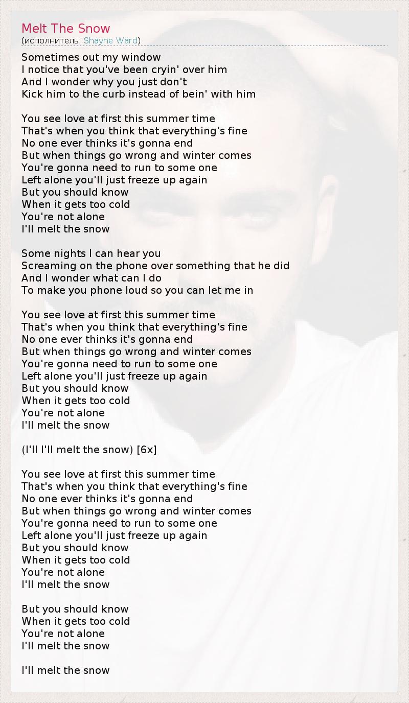 Иногда, глядя в своё окно, Я замечаю, что ты плачешь из-за него, И мне интересно, почему ты просто не Бросишь его, вместо того, чтобы быть с ним. Вначале любовь кажется вам летом, Именно тогда вы думаете, что всё прекрасно, Ни у кого и в мыслях нет, что всё это может закончиться. Но когда дела идут плохо, вот тогда наступает зима, Ты отстраняешься ото всех, Остаешься в одиночестве, и снова замерзаешь. Но знай, Что когда становится слишком холодно, Ты не одна - Я растоплю снег. Иногда по вечерам я слышу, как ты Кричишь на него по телефону, за его поступки, И мне интересно, что я могу сделать, Чтобы ты так же позвонила мне и попросила прийти. Вначале любовь кажется вам летом, Именно тогда вы думаете, что всё прекрасно, Ни у кого и в мыслях нет, что всё это может закончиться. Но когда дела идут плохо, вот тогда наступает зима, Ты отстраняешься ото всех, Остаешься в одиночестве, и снова замерзаешь. Но знай, Что когда становится слишком холодно, Ты не одна - Я растоплю снег. (Я, я растоплю снег) [6x] Вначале любовь кажется вам летом, Именно тогда вы думаете, что всё прекрасно, Ни у кого и в мыслях нет, что всё это может закончиться. Но когда дела идут плохо, вот тогда наступает зима, Ты отстраняешься ото всех, Остаешься в одиночестве, и снова замерзаешь. Но знай, Что когда становится слишком холодно, Ты не одна - Я растоплю снег. Но знай, Что когда становится слишком холодно, Ты не одна - Я растоплю снег. Я растоплю снег...