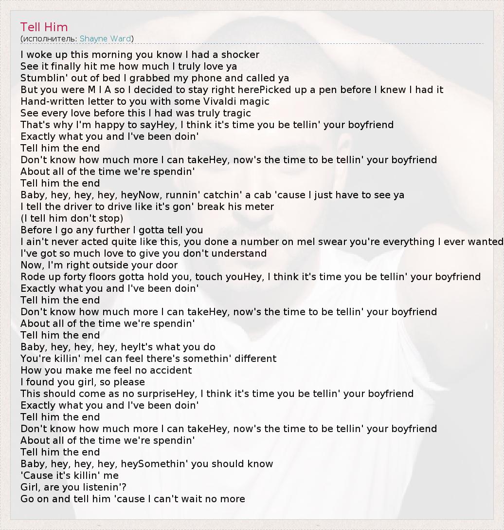 Don't know how much more I can takeHey, now's the time to be tellin' your boyfriend