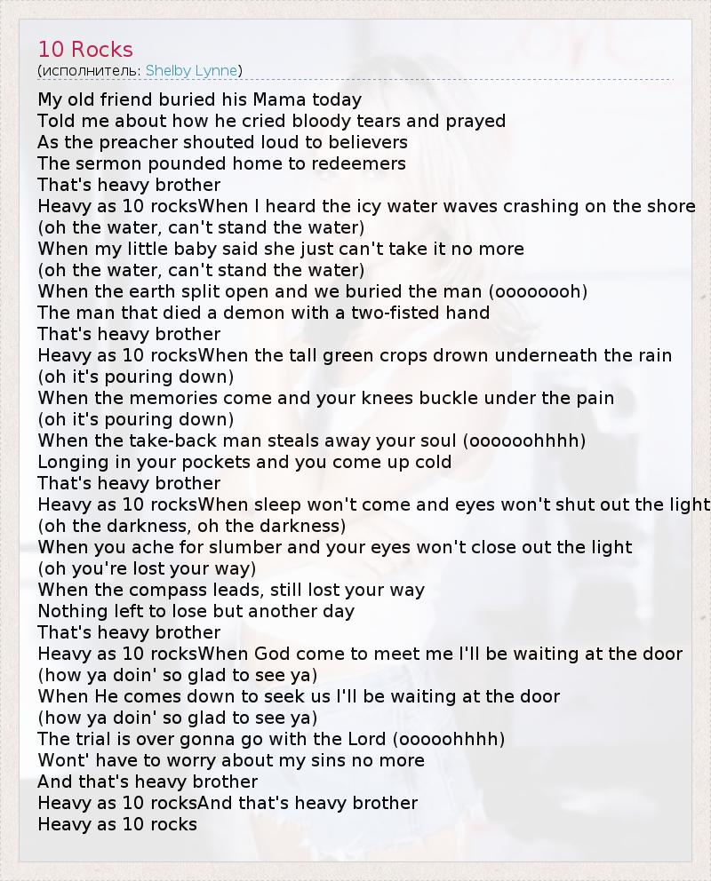 My old friend buried his Mama today Told me about how he cried bloody tears and prayed As the preacher shouted loud to believers The sermon pounded home to redeemers That's heavy brother Heavy as 10 rocksWhen I heard the icy water waves crashing on the shore (oh the water, can't stand the water) When my little baby said she just can't take it no more (oh the water, can't stand the water) When the earth split open and we buried the man (oooooooh) The man that died a demon with a two-fisted hand That's heavy brother Heavy as 10 rocksWhen the tall green crops drown underneath the rain (oh it's pouring down) When the memories come and your knees buckle under the pain (oh it's pouring down) When the take-back man steals away your soul (oooooohhhh) Longing in your pockets and you come up cold That's heavy brother Heavy as 10 rocksWhen sleep won't come and eyes won't shut out the light (oh the darkness, oh the darkness) When you ache for slumber and your eyes won't close out the light (oh you're lost your way) When the compass leads, still lost your way Nothing left to lose but another day That's heavy brother Heavy as 10 rocksWhen God come to meet me I'll be waiting at the door (how ya doin' so glad to see ya) When He comes down to seek us I'll be waiting at the door (how ya doin' so glad to see ya) The trial is over gonna go with the Lord (ooooohhhh) Wont' have to worry about my sins no more And that's heavy brother Heavy as 10 rocksAnd that's heavy brother Heavy as 10 rocks