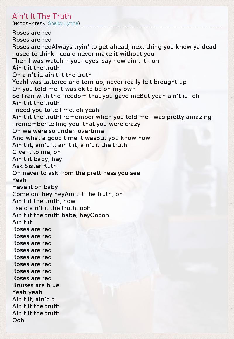Roses are red Roses are red Roses are redAlways tryin' to get ahead, next thing you know ya dead I used to think I could never make it without you Then I was watchin your eyesI say now ain't it - oh Ain't it the truth Oh ain't it, ain't it the truth YeahI was tattered and torn up, never really felt brought up Oh you told me it was ok to be on my own So I ran with the freedom that you gave meBut yeah ain't it - oh Ain't it the truth I need you to tell me, oh yeah Ain't it the truthI remember when you told me I was pretty amazing I remember telling you, that you were crazy Oh we were so under, overtime And what a good time it wasBut you know now Ain't it, ain't it, ain't it, ain't it the truth Give it to me, oh Ain't it baby, hey Ask Sister Ruth Oh never to ask from the prettiness you see Yeah Have it on baby Come on, hey heyAin't it the truth, oh Ain't it the truth, now I said ain't it the truth, ooh Ain't it the truth babe, heyOoooh Ain't it Roses are red Roses are red Roses are red Roses are red Roses are red Roses are red Roses are red Roses are red Bruises are blue Yeah yeah Ain't it, ain't it Ain't it the truth Ain't it the truth Ooh