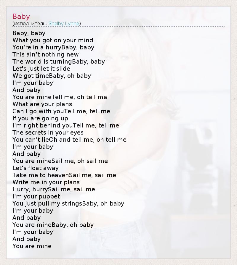 Baby, baby What you got on your mind You're in a hurryBaby, baby This ain't nothing new The world is turningBaby, baby Let's just let it slide We got timeBaby, oh baby I'm your baby And baby You are mineTell me, oh tell me What are your plans Can I go with youTell me, tell me If you are going up I'm right behind youTell me, tell me The secrets in your eyes You can't lieOh and tell me, oh tell me I'm your baby And baby You are mineSail me, oh sail me Let's float away Take me to heavenSail me, sail me Write me in your plans Hurry, hurrySail me, sail me I'm your puppet You just pull my stringsBaby, oh baby I'm your baby And baby You are mineBaby, oh baby I'm your baby And baby You are mine