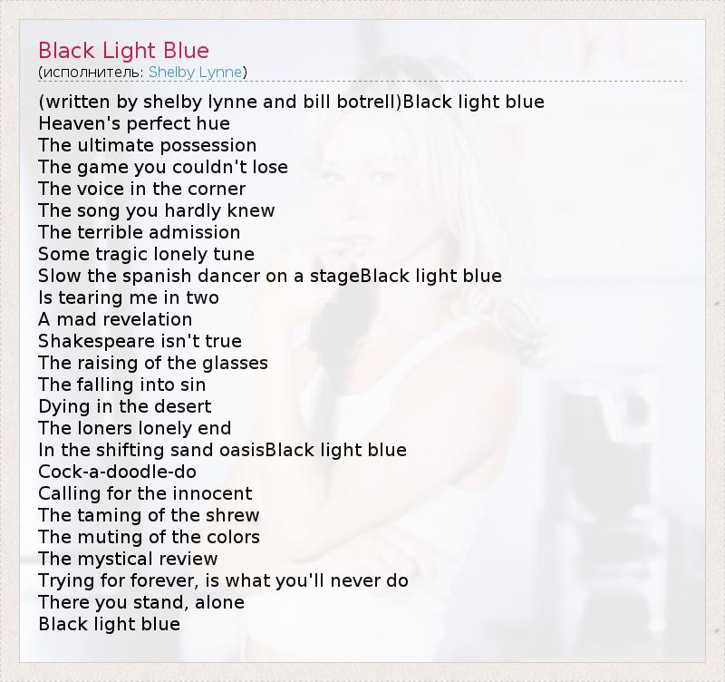 (written by shelby lynne and bill botrell)Black light blue Heaven's perfect hue The ultimate possession The game you couldn't lose The voice in the corner The song you hardly knew The terrible admission Some tragic lonely tune Slow the spanish dancer on a stageBlack light blue Is tearing me in two A mad revelation Shakespeare isn't true The raising of the glasses The falling into sin Dying in the desert The loners lonely end In the shifting sand oasisBlack light blue Cock-a-doodle-do Calling for the innocent The taming of the shrew The muting of the colors The mystical review Trying for forever, is what you'll never do There you stand, alone Black light blue