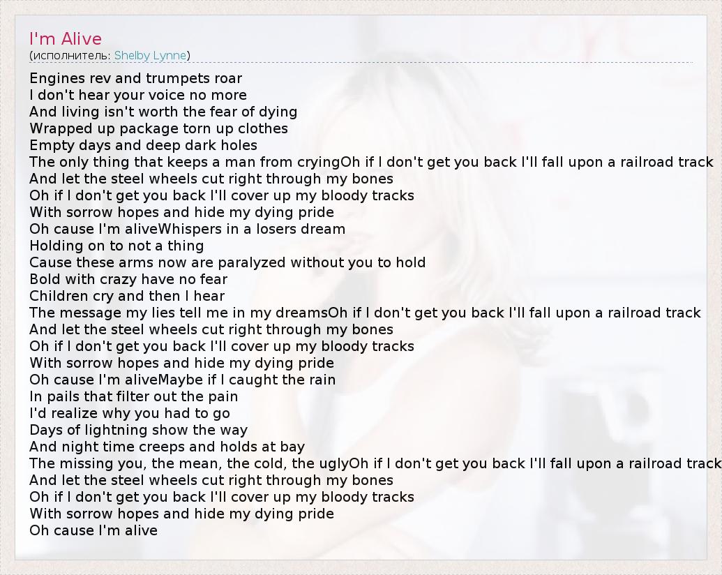 Engines rev and trumpets roar I don't hear your voice no more And living isn't worth the fear of dying Wrapped up package torn up clothes Empty days and deep dark holes The only thing that keeps a man from cryingOh if I don't get you back I'll fall upon a railroad track And let the steel wheels cut right through my bones Oh if I don't get you back I'll cover up my bloody tracks With sorrow hopes and hide my dying pride Oh cause I'm aliveWhispers in a losers dream Holding on to not a thing Cause these arms now are paralyzed without you to hold Bold with crazy have no fear Children cry and then I hear The message my lies tell me in my dreamsOh if I don't get you back I'll fall upon a railroad track And let the steel wheels cut right through my bones Oh if I don't get you back I'll cover up my bloody tracks With sorrow hopes and hide my dying pride Oh cause I'm aliveMaybe if I caught the rain In pails that filter out the pain I'd realize why you had to go Days of lightning show the way And night time creeps and holds at bay The missing you, the mean, the cold, the uglyOh if I don't get you back I'll fall upon a railroad track And let the steel wheels cut right through my bones Oh if I don't get you back I'll cover up my bloody tracks With sorrow hopes and hide my dying pride Oh cause I'm alive