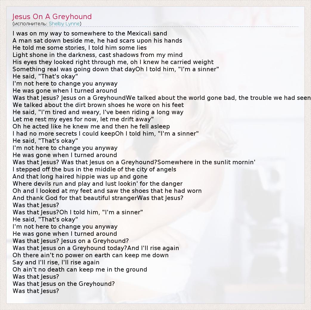 А как ты думаешь, о чем песня "Jesus On A Greyhound" ?