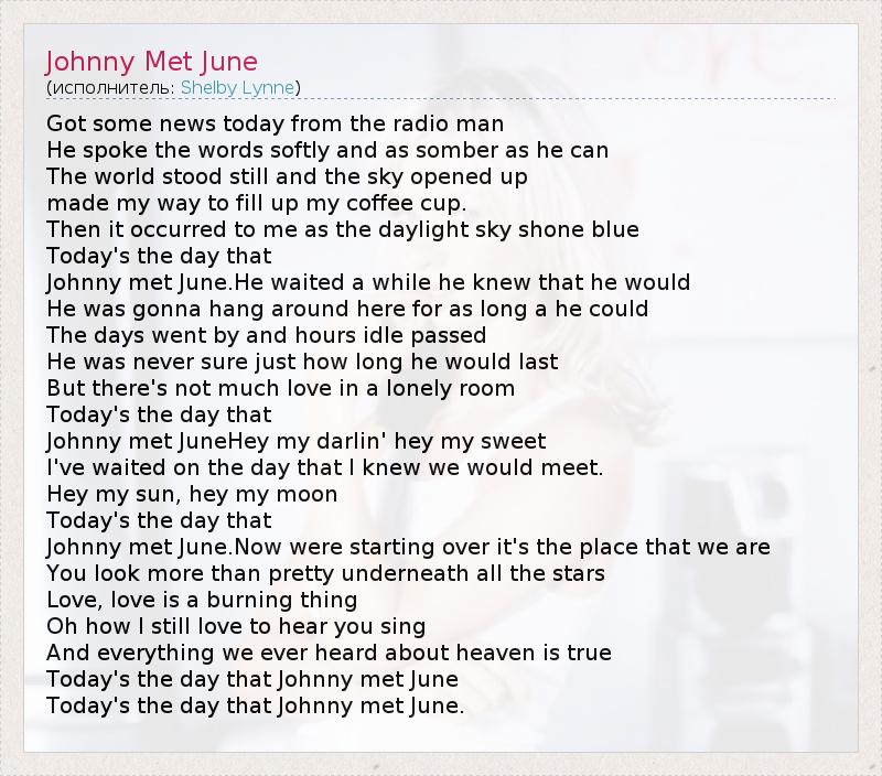 Got some news today from the radio man He spoke the words softly and as somber as he can The world stood still and the sky opened up made my way to fill up my coffee cup. Then it occurred to me as the daylight sky shone blue Today's the day that Johnny met June.He waited a while he knew that he would He was gonna hang around here for as long a he could The days went by and hours idle passed He was never sure just how long he would last But there's not much love in a lonely room Today's the day that Johnny met JuneHey my darlin' hey my sweet I've waited on the day that I knew we would meet. Hey my sun, hey my moon Today's the day that Johnny met June.Now were starting over it's the place that we are You look more than pretty underneath all the stars Love, love is a burning thing Oh how I still love to hear you sing And everything we ever heard about heaven is true Today's the day that Johnny met June Today's the day that Johnny met June.