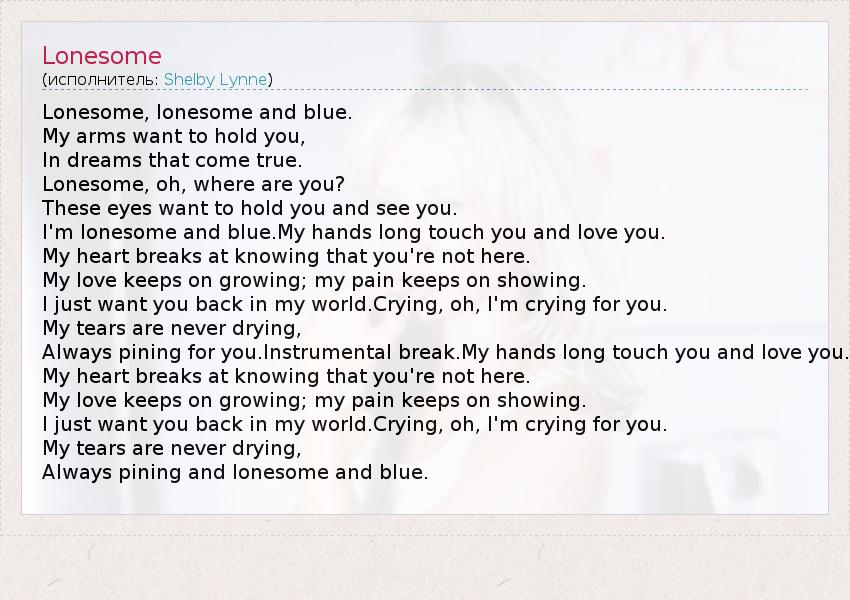Lonesome, lonesome and blue. My arms want to hold you, In dreams that come true. Lonesome, oh, where are you? These eyes want to hold you and see you. I'm lonesome and blue.My hands long touch you and love you. My heart breaks at knowing that you're not here. My love keeps on growing; my pain keeps on showing. I just want you back in my world.Crying, oh, I'm crying for you. My tears are never drying, Always pining for you.Instrumental break.My hands long touch you and love you. My heart breaks at knowing that you're not here. My love keeps on growing; my pain keeps on showing. I just want you back in my world.Crying, oh, I'm crying for you. My tears are never drying, Always pining and lonesome and blue.