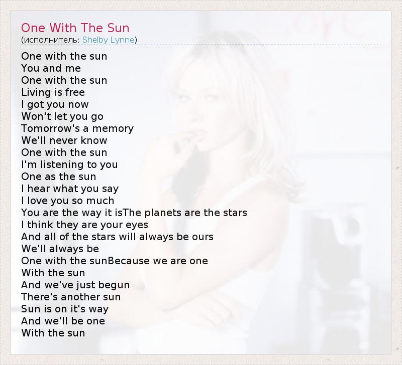 One with the sun You and me One with the sun Living is free I got you now Won't let you go Tomorrow's a memory We'll never know One with the sun I'm listening to you One as the sun I hear what you say I love you so much You are the way it isThe planets are the stars I think they are your eyes And all of the stars will always be ours We'll always be One with the sunBecause we are one With the sun And we've just begun There's another sun Sun is on it's way And we'll be one With the sun