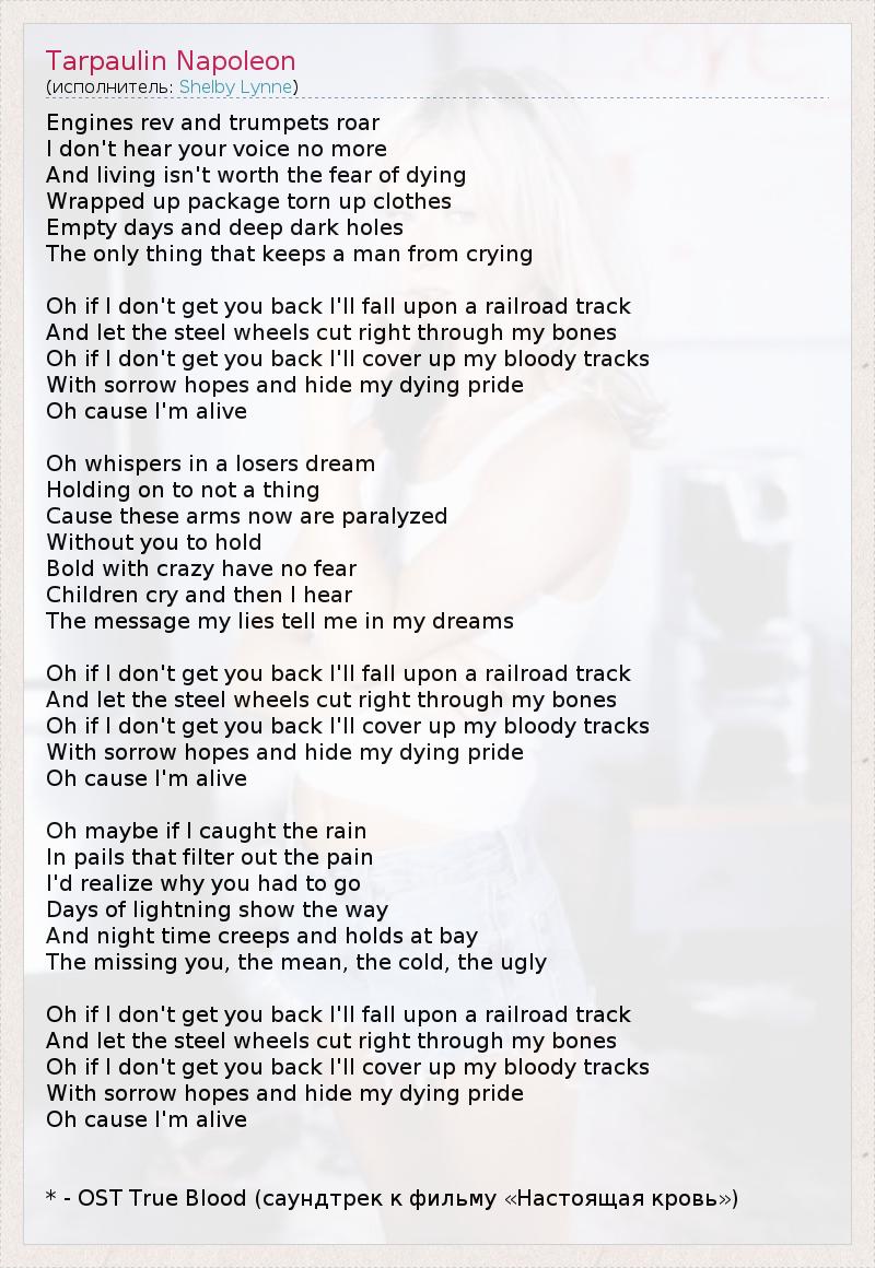 Engines rev and trumpets roar I don't hear your voice no more And living isn't worth the fear of dying Wrapped up package torn up clothes Empty days and deep dark holes The only thing that keeps a man from crying Oh if I don't get you back I'll fall upon a railroad track And let the steel wheels cut right through my bones Oh if I don't get you back I'll cover up my bloody tracks With sorrow hopes and hide my dying pride Oh cause I'm alive Oh whispers in a losers dream Holding on to not a thing Cause these arms now are paralyzed Without you to hold Bold with crazy have no fear Children cry and then I hear The message my lies tell me in my dreams Oh if I don't get you back I'll fall upon a railroad track And let the steel wheels cut right through my bones Oh if I don't get you back I'll cover up my bloody tracks With sorrow hopes and hide my dying pride Oh cause I'm alive Oh maybe if I caught the rain In pails that filter out the pain I'd realize why you had to go Days of lightning show the way And night time creeps and holds at bay The missing you, the mean, the cold, the ugly Oh if I don't get you back I'll fall upon a railroad track And let the steel wheels cut right through my bones Oh if I don't get you back I'll cover up my bloody tracks With sorrow hopes and hide my dying pride Oh cause I'm alive * - OST True Blood (саундтрек к фильму «Настоящая кровь»)