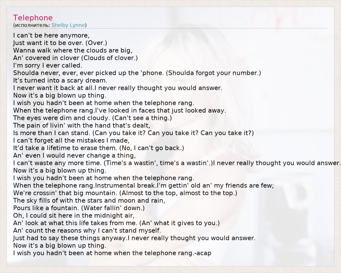 I can't be here anymore, Just want it to be over. (Over.) Wanna walk where the clouds are big, An' covered in clover (Clouds of clover.) I'm sorry I ever called. Shoulda never, ever, ever picked up the 'phone. (Shoulda forgot your number.) It's turned into a scary dream. I never want it back at all.I never really thought you would answer. Now it's a big blown up thing. I wish you hadn't been at home when the telephone rang. When the telephone rang.I've looked in faces that just looked away. The eyes were dim and cloudy. (Can't see a thing.) The pain of livin' with the hand that's dealt, Is more than I can stand. (Can you take it? Can you take it? Can you take it?) I can't forget all the mistakes I made, It'd take a lifetime to erase them. (No, I can't go back.) An' even I would never change a thing, I can't waste any more time. (Time's a wastin', time's a wastin'.)I never really thought you would answer. Now it's a big blown up thing. I wish you hadn't been at home when the telephone rang. When the telephone rang.Instrumental break.I'm gettin' old an' my friends are few; We're crossin' that big mountain. (Almost to the top, almost to the top.) The sky fills of with the stars and moon and rain, Pours like a fountain. (Water fallin' down.) Oh, I could sit here in the midnight air, An' look at what this life takes from me. (An' what it gives to you.) An' count the reasons why I can't stand myself. Just had to say these things anyway.I never really thought you would answer. Now it's a big blown up thing. I wish you hadn't been at home when the telephone rang.-acap
