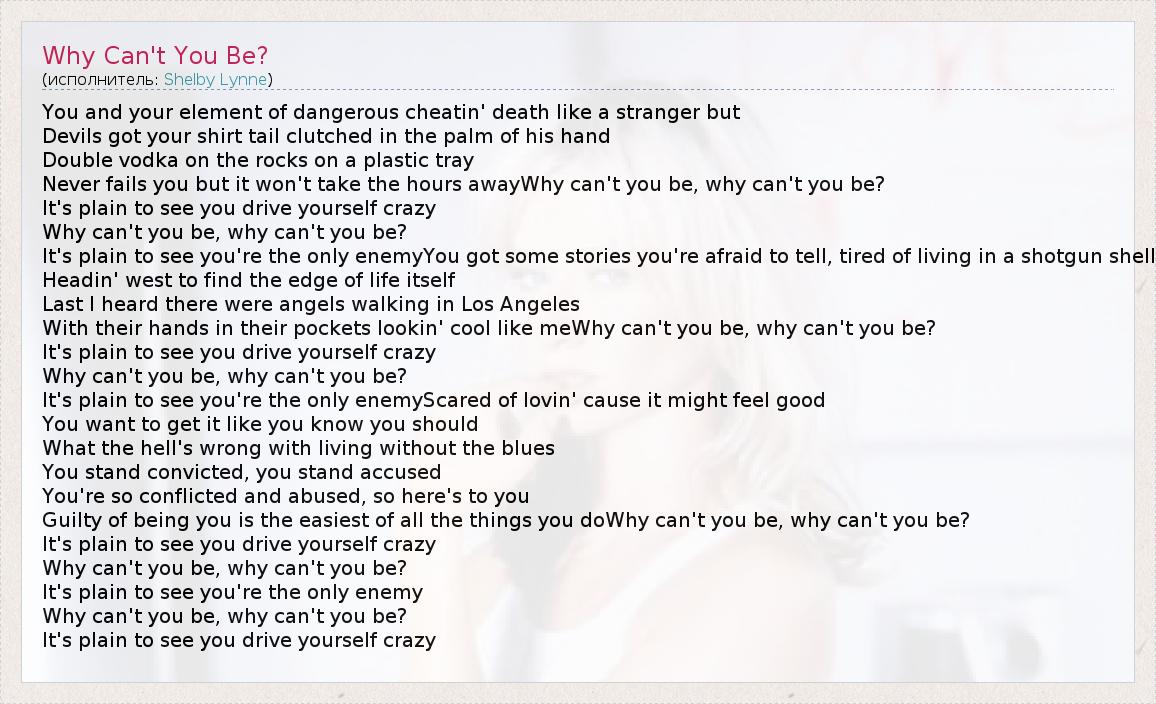 You and your element of dangerous cheatin' death like a stranger but Devils got your shirt tail clutched in the palm of his hand Double vodka on the rocks on a plastic tray Never fails you but it won't take the hours awayWhy can't you be, why can't you be? It's plain to see you drive yourself crazy Why can't you be, why can't you be? It's plain to see you're the only enemyYou got some stories you're afraid to tell, tired of living in a shotgun shell Headin' west to find the edge of life itself Last I heard there were angels walking in Los Angeles With their hands in their pockets lookin' cool like meWhy can't you be, why can't you be? It's plain to see you drive yourself crazy Why can't you be, why can't you be? It's plain to see you're the only enemyScared of lovin' cause it might feel good You want to get it like you know you should What the hell's wrong with living without the blues You stand convicted, you stand accused You're so conflicted and abused, so here's to you Guilty of being you is the easiest of all the things you doWhy can't you be, why can't you be? It's plain to see you drive yourself crazy Why can't you be, why can't you be? It's plain to see you're the only enemy Why can't you be, why can't you be? It's plain to see you drive yourself crazy