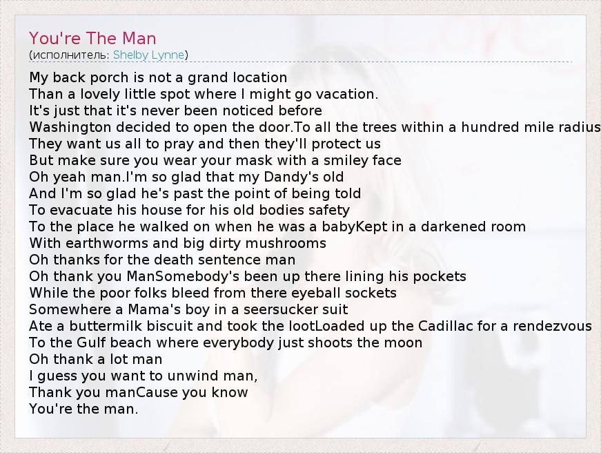 My back porch is not a grand location Than a lovely little spot where I might go vacation. It's just that it's never been noticed before Washington decided to open the door.To all the trees within a hundred mile radius They want us all to pray and then they'll protect us But make sure you wear your mask with a smiley face Oh yeah man.I'm so glad that my Dandy's old And I'm so glad he's past the point of being told To evacuate his house for his old bodies safety To the place he walked on when he was a babyKept in a darkened room With earthworms and big dirty mushrooms Oh thanks for the death sentence man Oh thank you ManSomebody's been up there lining his pockets While the poor folks bleed from there eyeball sockets Somewhere a Mama's boy in a seersucker suit Ate a buttermilk biscuit and took the lootLoaded up the Cadillac for a rendezvous To the Gulf beach where everybody just shoots the moon Oh thank a lot man I guess you want to unwind man, Thank you manCause you know You're the man.