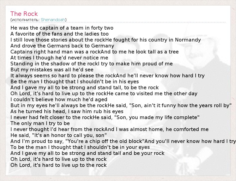 He was the captain of a team in forty two A favorite of the fans and the ladies too I still love those stories about the rockHe fought for his country in Normandy And drove the Germans back to Germany Captains right hand man was a rockAnd to me he look tall as a tree At times I though he'd never notice me Standing in the shadow of the rockI try to make him proud of me But my mistakes was all he'd see It always seems so hard to please the rockAnd he'll never know how hard I try Be the man I thought that I shouldn't be in his eyes And I gave my all to be strong and stand tall, to be the rock Oh Lord, it's hard to live up to the rockHe came to visited me the other day I couldn't believe how much he'd aged But in my eyes he'll always be the rockHe said, "Son, ain't it funny how the years roll by" As he turned his head, I saw him rub his eyes I never had felt closer to the rockHe said, "Son, you made my life complete" The only man I try to be I never thought I'd hear from the rockAnd I was almost home, he comforted me He said, "It's an honor to call you, son" And I'm proud to say, "You're a chip off the old block"And you'll never know how hard I try To be the man I thought that I shouldn't be in your eyes And I gave my all to be strong and stand tall and be your rock Oh Lord, it's hard to live up to the rock Oh Lord, it's hard to live up to the rock