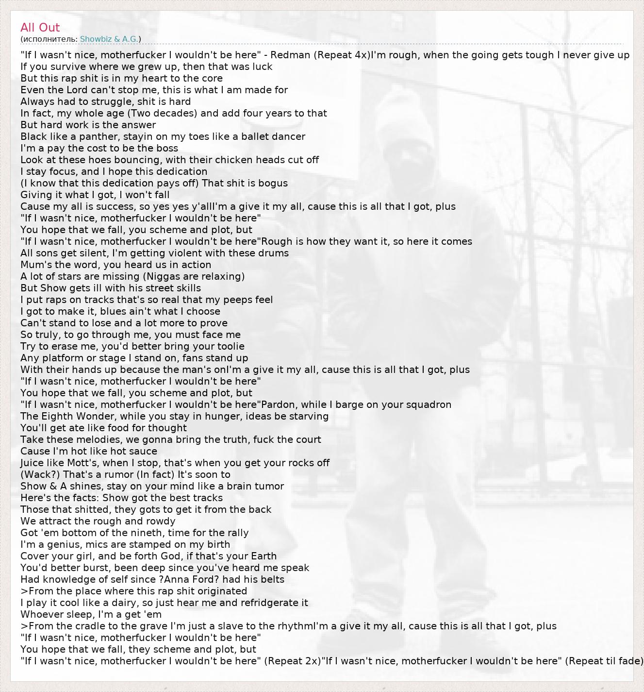 Это интересно:Showbiz & A.G. (так же известны как Show & A.G.) - американский хип-хоп дуэт из The Bronx, New York City. Showbiz - продюсер, A.G. (сокращенное от André the Giant) - рэпер. Впервые они засветились на альбоме Lord Finesse "Funky Technician" в 1990 году. Show & A.G. - участники легендарной команды Diggin' in the Crates (D.I.T.C.) вместе с Lord Finesse, Diamond D, Fat Joe, O.C., Buckwild и ныне покойным Big L. Первым полноценным релизом дуэта стал EP "Soul Clap", выпущенный в... продолжение