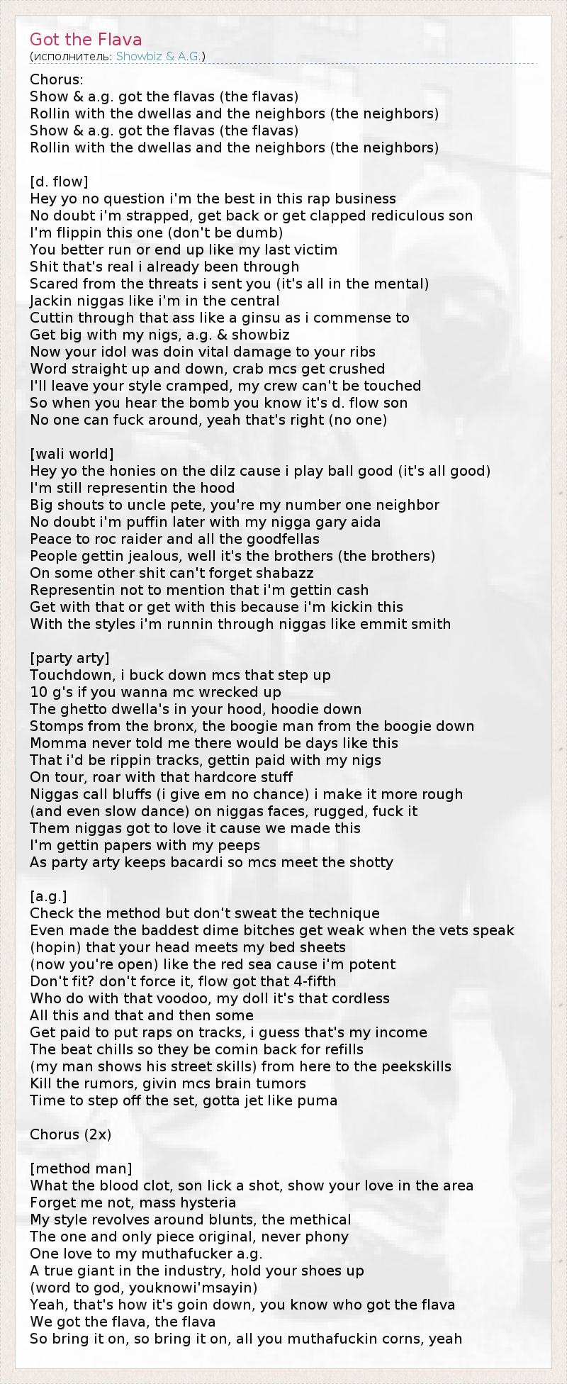 Chorus: Show & a.g. got the flavas (the flavas) Rollin with the dwellas and the neighbors (the neighbors) Show & a.g. got the flavas (the flavas) Rollin with the dwellas and the neighbors (the neighbors) [d. flow] Hey yo no question i'm the best in this rap business No doubt i'm strapped, get back or get clapped rediculous son I'm flippin this one (don't be dumb) You better run or end up like my last victim Shit that's real i already been through Scared from the threats i sent you (it's all in the mental) Jackin niggas like i'm in the central Cuttin through that ass like a ginsu as i commense to Get big with my nigs, a.g. & showbiz Now your idol was doin vital damage to your ribs Word straight up and down, crab mcs get crushed I'll leave your style cramped, my crew can't be touched So when you hear the bomb you know it's d. flow son No one can fuck around, yeah that's right (no one) [wali world] Hey yo the honies on the dilz cause i play ball good (it's all good) I'm still representin the hood Big shouts to uncle pete, you're my number one neighbor No doubt i'm puffin later with my nigga gary aida Peace to roc raider and all the goodfellas People gettin jealous, well it's the brothers (the brothers) On some other shit can't forget shabazz Representin not to mention that i'm gettin cash Get with that or get with this because i'm kickin this With the styles i'm runnin through niggas like emmit smith [party arty] Touchdown, i buck down mcs that step up 10 g's if you wanna mc wrecked up The ghetto dwella's in your hood, hoodie down Stomps from the bronx, the boogie man from the boogie down Momma never told me there would be days like this That i'd be rippin tracks, gettin paid with my nigs On tour, roar with that hardcore stuff Niggas call bluffs (i give em no chance) i make it more rough (and even slow dance) on niggas faces, rugged, fuck it Them niggas got to love it cause we made this I'm gettin papers with my peeps As party arty keeps bacardi so mcs meet the shotty [a.g.] Check the method but don't sweat the technique Even made the baddest dime bitches get weak when the vets speak (hopin) that your head meets my bed sheets (now you're open) like the red sea cause i'm potent Don't fit? don't force it, flow got that 4-fifth Who do with that voodoo, my doll it's that cordless All this and that and then some Get paid to put raps on tracks, i guess that's my income The beat chills so they be comin back for refills (my man shows his street skills) from here to the peekskills Kill the rumors, givin mcs brain tumors Time to step off the set, gotta jet like puma Chorus (2x) [method man] What the blood clot, son lick a shot, show your love in the area Forget me not, mass hysteria My style revolves around blunts, the methical The one and only piece original, never phony One love to my muthafucker a.g. A true giant in the industry, hold your shoes up (word to god, youknowi'msayin) Yeah, that's how it's goin down, you know who got the flava We got the flava, the flava So bring it on, so bring it on, all you muthafuckin corns, yeah