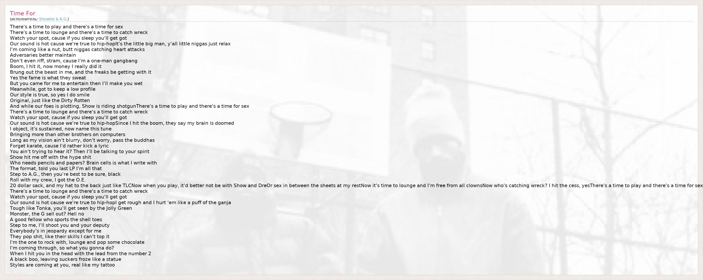20 dollar sack, and my hat to the back just like TLCNow when you play, it'd better not be with Show and DreOr sex in between the sheets at my restNow it's time to lounge and I'm free from all clownsNow who's catching wreck? I hit the cess, yesThere's a time to play and there's a time for sex