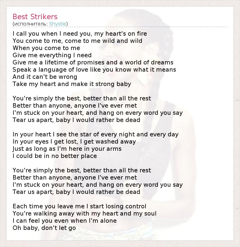 I call you when I need you, my heart's on fire You come to me, come to me wild and wild When you come to me Give me everything I need Give me a lifetime of promises and a world of dreams Speak a language of love like you know what it means And it can't be wrong Take my heart and make it strong baby You're simply the best, better than all the rest Better than anyone, anyone I've ever met I'm stuck on your heart, and hang on every word you say Tear us apart, baby I would rather be dead In your heart I see the star of every night and every day In your eyes I get lost, I get washed away Just as long as I'm here in your arms I could be in no better place You're simply the best, better than all the rest Better than anyone, anyone I've ever met I'm stuck on your heart, and hang on every word you say Tear us apart, baby I would rather be dead Each time you leave me I start losing control You're walking away with my heart and my soul I can feel you even when I'm alone Oh baby, don't let go