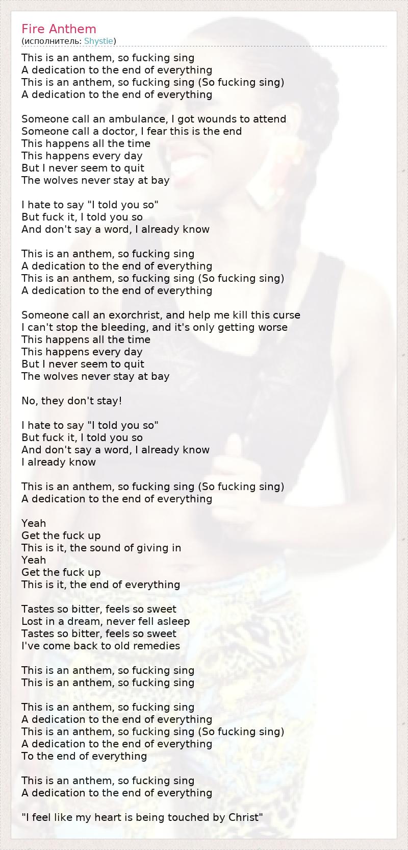 This is an anthem, so fucking sing A dedication to the end of everything This is an anthem, so fucking sing (So fucking sing) A dedication to the end of everything Someone call an ambulance, I got wounds to attend Someone call a doctor, I fear this is the end This happens all the time This happens every day But I never seem to quit The wolves never stay at bay I hate to say "I told you so" But fuck it, I told you so And don't say a word, I already know This is an anthem, so fucking sing A dedication to the end of everything This is an anthem, so fucking sing (So fucking sing) A dedication to the end of everything Someone call an exorchrist, and help me kill this curse I can't stop the bleeding, and it's only getting worse This happens all the time This happens every day But I never seem to quit The wolves never stay at bay No, they don't stay! I hate to say "I told you so" But fuck it, I told you so And don't say a word, I already know I already know This is an anthem, so fucking sing (So fucking sing) A dedication to the end of everything Yeah Get the fuck up This is it, the sound of giving in Yeah Get the fuck up This is it, the end of everything Tastes so bitter, feels so sweet Lost in a dream, never fell asleep Tastes so bitter, feels so sweet I've come back to old remedies This is an anthem, so fucking sing This is an anthem, so fucking sing This is an anthem, so fucking sing A dedication to the end of everything This is an anthem, so fucking sing (So fucking sing) A dedication to the end of everything To the end of everything This is an anthem, so fucking sing A dedication to the end of everything "I feel like my heart is being touched by Christ"