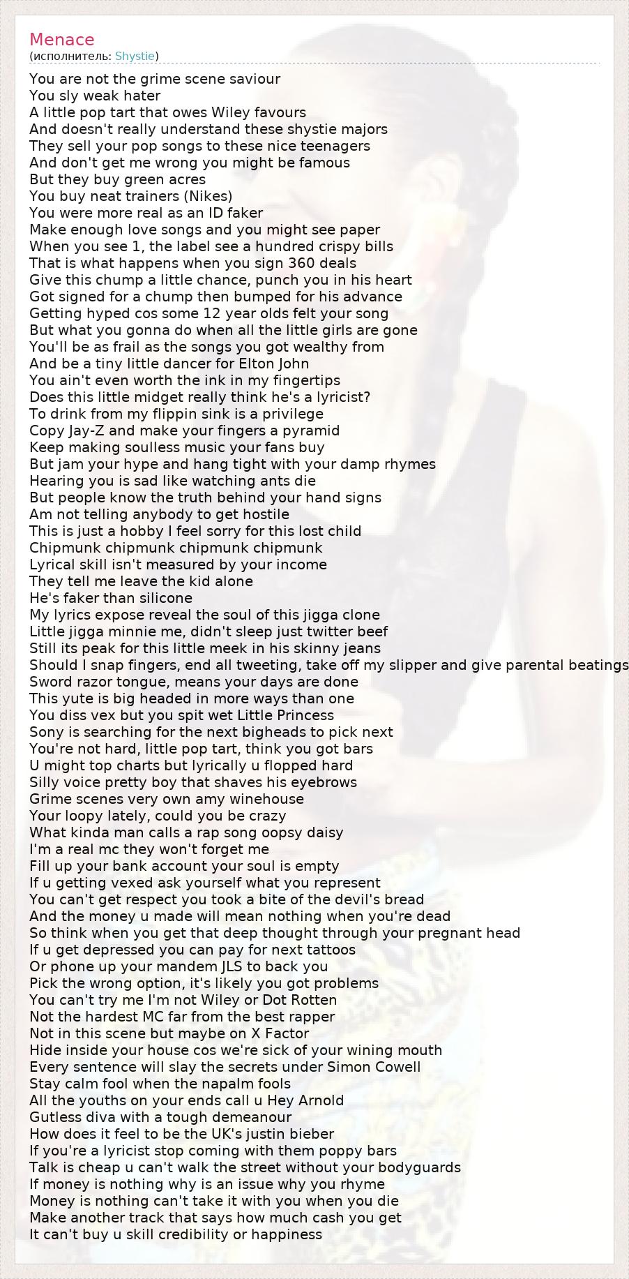 You are not the grime scene saviour You sly weak hater A little pop tart that owes Wiley favours And doesn't really understand these shystie majors They sell your pop songs to these nice teenagers And don't get me wrong you might be famous But they buy green acres You buy neat trainers (Nikes) You were more real as an ID faker Make enough love songs and you might see paper When you see 1, the label see a hundred crispy bills That is what happens when you sign 360 deals Give this chump a little chance, punch you in his heart Got signed for a chump then bumped for his advance Getting hyped cos some 12 year olds felt your song But what you gonna do when all the little girls are gone You'll be as frail as the songs you got wealthy from And be a tiny little dancer for Elton John You ain't even worth the ink in my fingertips Does this little midget really think he's a lyricist? To drink from my flippin sink is a privilege Copy Jay-Z and make your fingers a pyramid Keep making soulless music your fans buy But jam your hype and hang tight with your damp rhymes Hearing you is sad like watching ants die But people know the truth behind your hand signs Am not telling anybody to get hostile This is just a hobby I feel sorry for this lost child Chipmunk chipmunk chipmunk chipmunk Lyrical skill isn't measured by your income They tell me leave the kid alone He's faker than silicone My lyrics expose reveal the soul of this jigga clone Little jigga minnie me, didn't sleep just twitter beef Still its peak for this little meek in his skinny jeans Should I snap fingers, end all tweeting, take off my slipper and give parental beatings Sword razor tongue, means your days are done This yute is big headed in more ways than one You diss vex but you spit wet Little Princess Sony is searching for the next bigheads to pick next You're not hard, little pop tart, think you got bars U might top charts but lyrically u flopped hard Silly voice pretty boy that shaves his eyebrows Grime scenes very own amy winehouse Your loopy lately, could you be crazy What kinda man calls a rap song oopsy daisy I'm a real mc they won't forget me Fill up your bank account your soul is empty If u getting vexed ask yourself what you represent You can't get respect you took a bite of the devil's bread And the money u made will mean nothing when you're dead So think when you get that deep thought through your pregnant head If u get depressed you can pay for next tattoos Or phone up your mandem JLS to back you Pick the wrong option, it's likely you got problems You can't try me I'm not Wiley or Dot Rotten Not the hardest MC far from the best rapper Not in this scene but maybe on X Factor Hide inside your house cos we're sick of your wining mouth Every sentence will slay the secrets under Simon Cowell Stay calm fool when the napalm fools All the youths on your ends call u Hey Arnold Gutless diva with a tough demeanour How does it feel to be the UK's justin bieber If you're a lyricist stop coming with them poppy bars Talk is cheap u can't walk the street without your bodyguards If money is nothing why is an issue why you rhyme Money is nothing can't take it with you when you die Make another track that says how much cash you get It can't buy u skill credibility or happiness