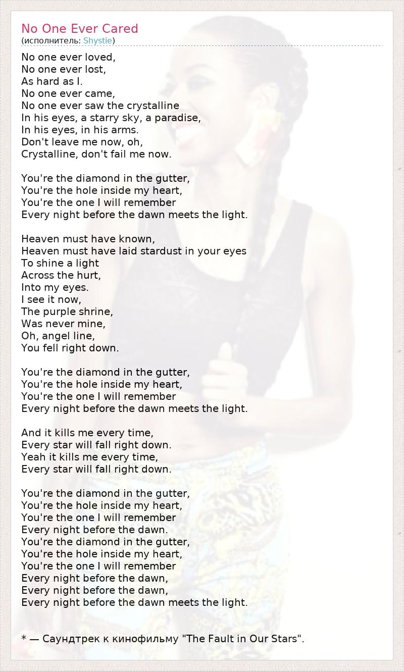 No one ever loved, No one ever lost, As hard as I. No one ever came, No one ever saw the crystalline In his eyes, a starry sky, a paradise, In his eyes, in his arms. Don't leave me now, oh, Crystalline, don't fail me now. You're the diamond in the gutter, You're the hole inside my heart, You're the one I will remember Every night before the dawn meets the light. Heaven must have known, Heaven must have laid stardust in your eyes To shine a light Across the hurt, Into my eyes. I see it now, The purple shrine, Was never mine, Oh, angel line, You fell right down. You're the diamond in the gutter, You're the hole inside my heart, You're the one I will remember Every night before the dawn meets the light. And it kills me every time, Every star will fall right down. Yeah it kills me every time, Every star will fall right down. You're the diamond in the gutter, You're the hole inside my heart, You're the one I will remember Every night before the dawn. You're the diamond in the gutter, You're the hole inside my heart, You're the one I will remember Every night before the dawn, Every night before the dawn, Every night before the dawn meets the light. * — Саундтрек к кинофильму "The Fault in Our Stars".