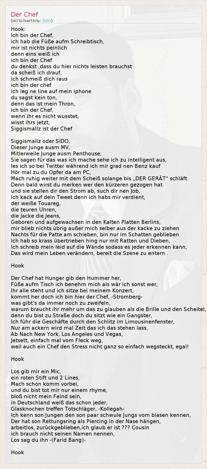 Это интересно:Sido родился 30 Ноября 1980 года в Берлине, настоящее имя Paul Wurdig. В 2001-2009 входил в немецкий лейбл Aggro Berlin.Sido отличается необычными агрессивными и провокационными текстами, но несмотря на это имеет лаконичный оттенок в голосе.Долгое время Sido вообще не снимал маску чтобы скрыть своё истинное лицо. Теперь он носит ее только как собственную визитную карточку.Sido рос с матерью и младшей... продолжение