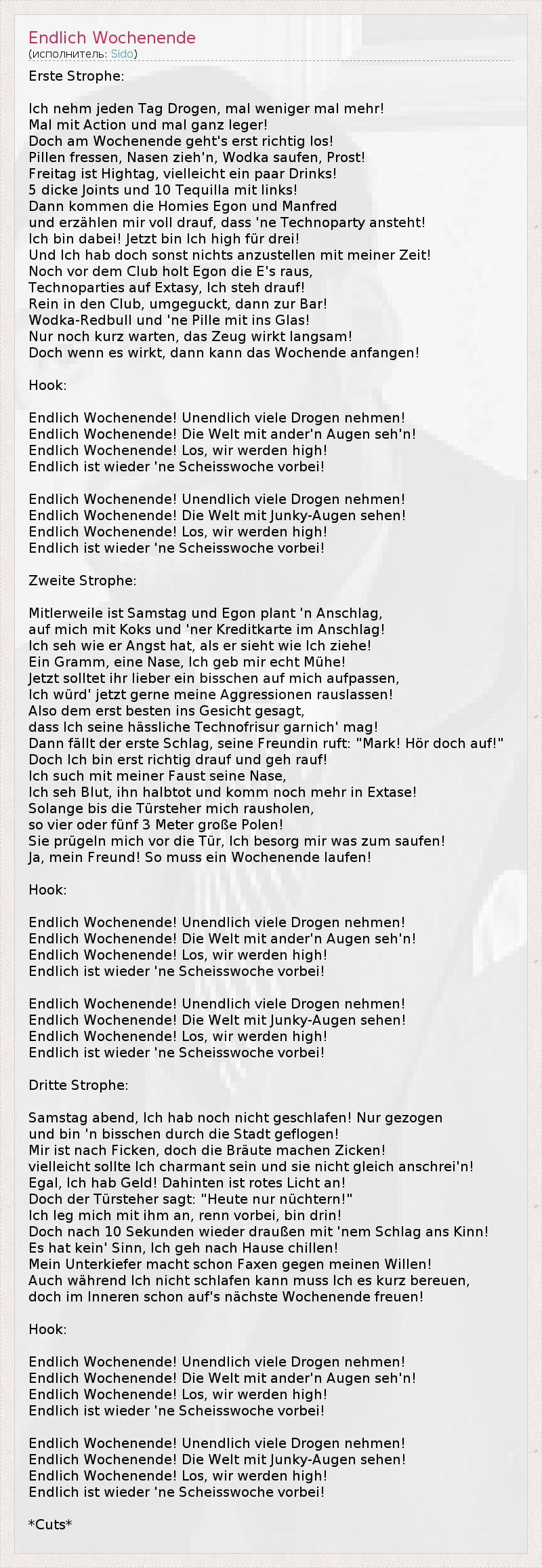 Erste Strophe: Ich nehm jeden Tag Drogen, mal weniger mal mehr! Mal mit Action und mal ganz leger! Doch am Wochenende geht's erst richtig los! Pillen fressen, Nasen zieh'n, Wodka saufen, Prost! Freitag ist Hightag, vielleicht ein paar Drinks! 5 dicke Joints und 10 Tequilla mit links! Dann kommen die Homies Egon und Manfred und erzählen mir voll drauf, dass 'ne Technoparty ansteht! Ich bin dabei! Jetzt bin Ich high für drei! Und Ich hab doch sonst nichts anzustellen mit meiner Zeit! Noch vor dem Club holt Egon die E's raus, Technoparties auf Extasy, Ich steh drauf! Rein in den Club, umgeguckt, dann zur Bar! Wodka-Redbull und 'ne Pille mit ins Glas! Nur noch kurz warten, das Zeug wirkt langsam! Doch wenn es wirkt, dann kann das Wochende anfangen! Hook: Endlich Wochenende! Unendlich viele Drogen nehmen! Endlich Wochenende! Die Welt mit ander'n Augen seh'n! Endlich Wochenende! Los, wir werden high! Endlich ist wieder 'ne Scheisswoche vorbei! Endlich Wochenende! Unendlich viele Drogen nehmen! Endlich Wochenende! Die Welt mit Junky-Augen sehen! Endlich Wochenende! Los, wir werden high! Endlich ist wieder 'ne Scheisswoche vorbei! Zweite Strophe: Mitlerweile ist Samstag und Egon plant 'n Anschlag, auf mich mit Koks und 'ner Kreditkarte im Anschlag! Ich seh wie er Angst hat, als er sieht wie Ich ziehe! Ein Gramm, eine Nase, Ich geb mir echt Mühe! Jetzt solltet ihr lieber ein bisschen auf mich aufpassen, Ich würd' jetzt gerne meine Aggressionen rauslassen! Also dem erst besten ins Gesicht gesagt, dass Ich seine hässliche Technofrisur garnich' mag! Dann fällt der erste Schlag, seine Freundin ruft: "Mark! Hör doch auf!" Doch Ich bin erst richtig drauf und geh rauf! Ich such mit meiner Faust seine Nase, Ich seh Blut, ihn halbtot und komm noch mehr in Extase! Solange bis die Türsteher mich rausholen, so vier oder fünf 3 Meter große Polen! Sie prügeln mich vor die Tür, Ich besorg mir was zum saufen! Ja, mein Freund! So muss ein Wochenende laufen! Hook: Endlich Wochenende! Unendlich viele Drogen nehmen! Endlich Wochenende! Die Welt mit ander'n Augen seh'n! Endlich Wochenende! Los, wir werden high! Endlich ist wieder 'ne Scheisswoche vorbei! Endlich Wochenende! Unendlich viele Drogen nehmen! Endlich Wochenende! Die Welt mit Junky-Augen sehen! Endlich Wochenende! Los, wir werden high! Endlich ist wieder 'ne Scheisswoche vorbei! Dritte Strophe: Samstag abend, Ich hab noch nicht geschlafen! Nur gezogen und bin 'n bisschen durch die Stadt geflogen! Mir ist nach Ficken, doch die Bräute machen Zicken! vielleicht sollte Ich charmant sein und sie nicht gleich anschrei'n! Egal, Ich hab Geld! Dahinten ist rotes Licht an! Doch der Türsteher sagt: "Heute nur nüchtern!" Ich leg mich mit ihm an, renn vorbei, bin drin! Doch nach 10 Sekunden wieder draußen mit 'nem Schlag ans Kinn! Es hat kein' Sinn, Ich geh nach Hause chillen! Mein Unterkiefer macht schon Faxen gegen meinen Willen! Auch während Ich nicht schlafen kann muss Ich es kurz bereuen, doch im Inneren schon auf's nächste Wochenende freuen! Hook: Endlich Wochenende! Unendlich viele Drogen nehmen! Endlich Wochenende! Die Welt mit ander'n Augen seh'n! Endlich Wochenende! Los, wir werden high! Endlich ist wieder 'ne Scheisswoche vorbei! Endlich Wochenende! Unendlich viele Drogen nehmen! Endlich Wochenende! Die Welt mit Junky-Augen sehen! Endlich Wochenende! Los, wir werden high! Endlich ist wieder 'ne Scheisswoche vorbei! *Cuts*