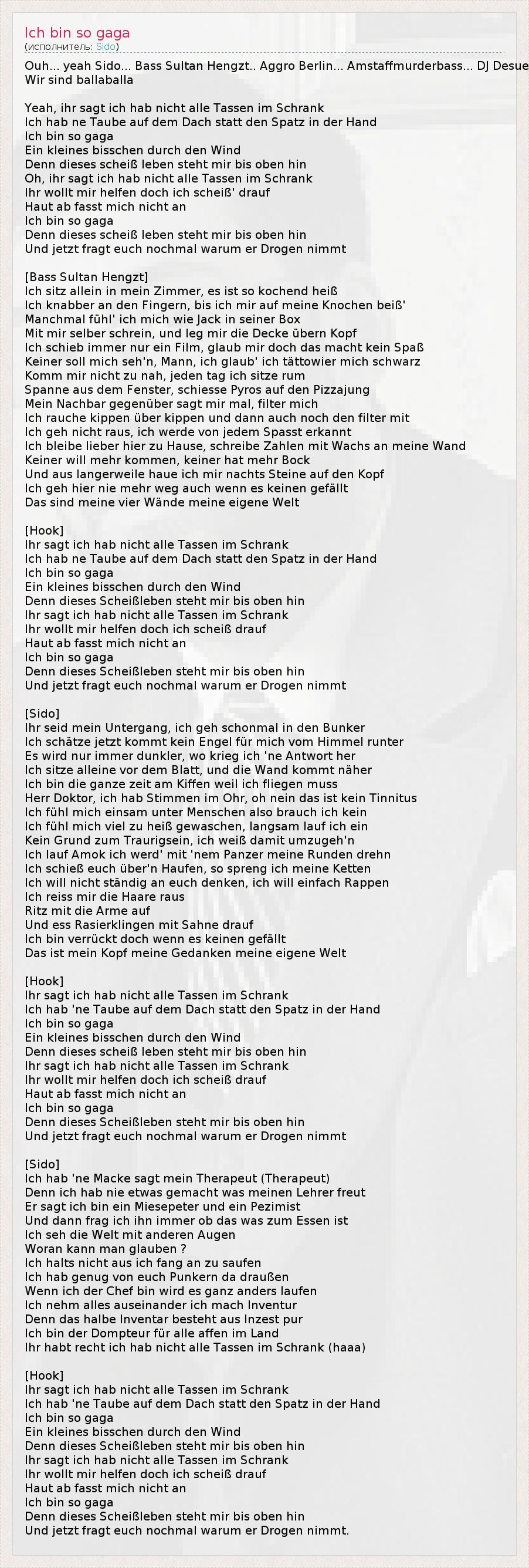 Это интересно:Sido родился 30 Ноября 1980 года в Берлине, настоящее имя Paul Wurdig. В 2001-2009 входил в немецкий лейбл Aggro Berlin.Sido отличается необычными агрессивными и провокационными текстами, но несмотря на это имеет лаконичный оттенок в голосе.Долгое время Sido вообще не снимал маску чтобы скрыть своё истинное лицо. Теперь он носит ее только как собственную визитную карточку.Sido рос с матерью и младшей... продолжение