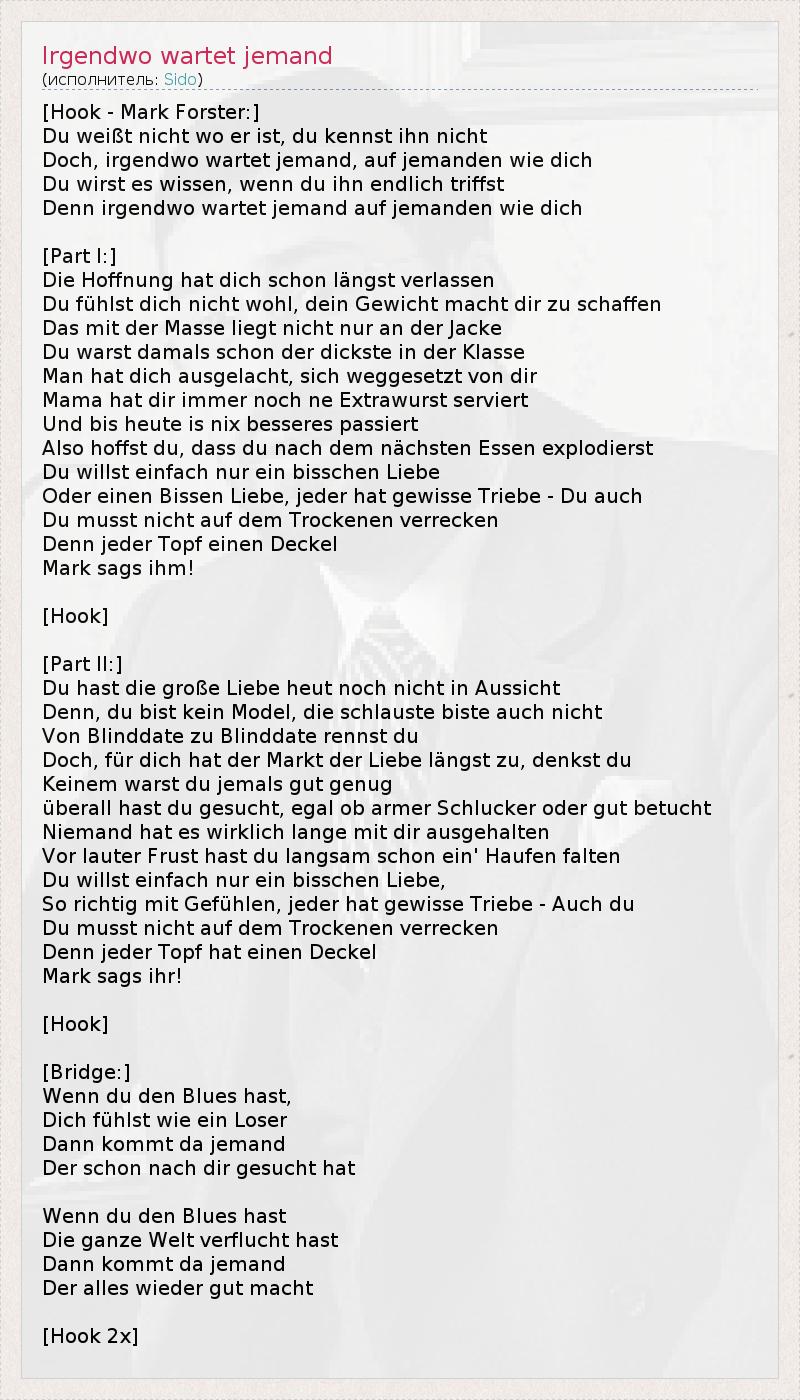 ГлавнаяИсполнителиSidoIrgendwo wartet jemand