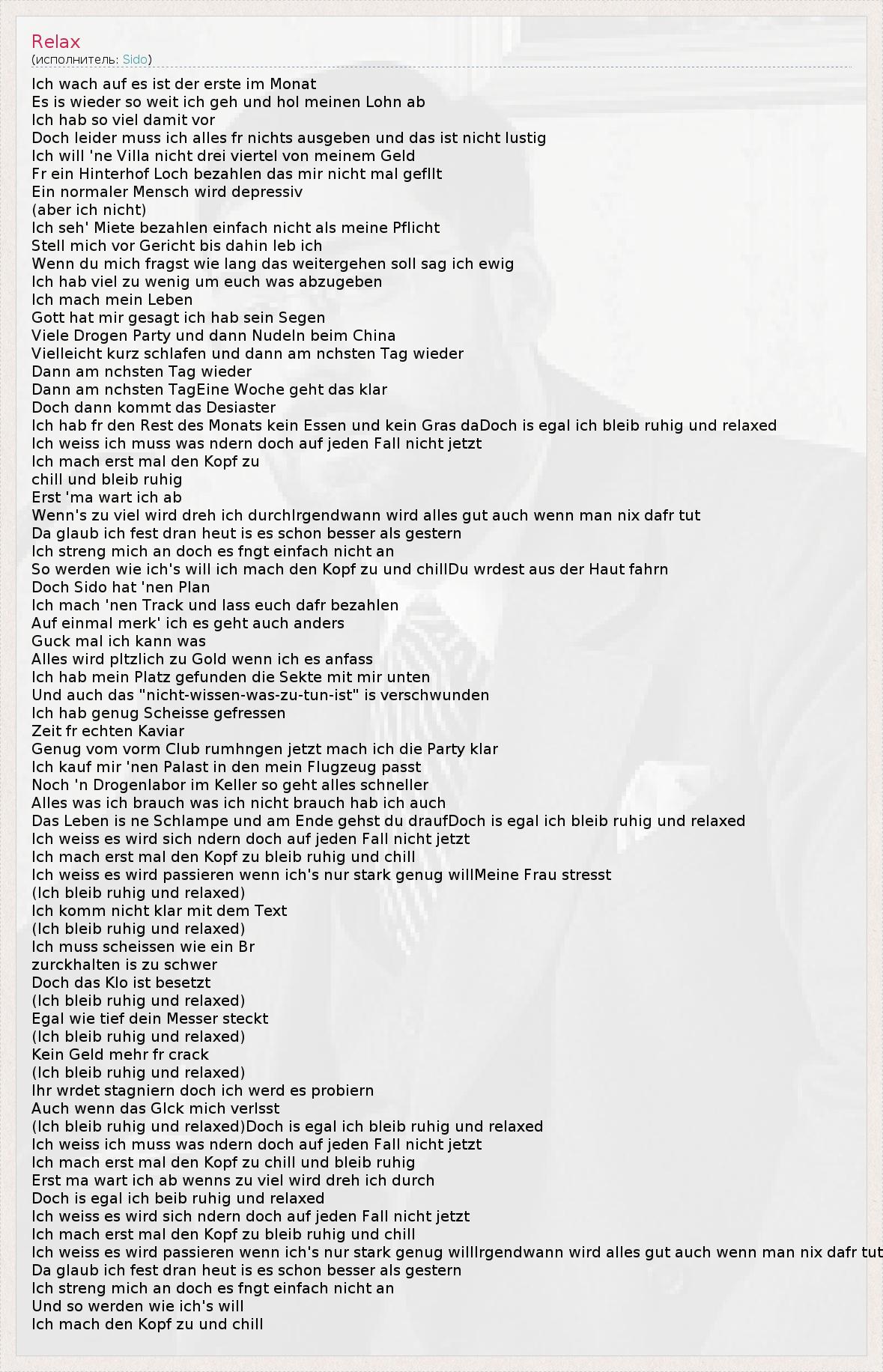 Ich wach auf es ist der erste im Monat Es is wieder so weit ich geh und hol meinen Lohn ab Ich hab so viel damit vor Doch leider muss ich alles fr nichts ausgeben und das ist nicht lustig Ich will 'ne Villa nicht drei viertel von meinem Geld Fr ein Hinterhof Loch bezahlen das mir nicht mal gefllt Ein normaler Mensch wird depressiv (aber ich nicht) Ich seh' Miete bezahlen einfach nicht als meine Pflicht Stell mich vor Gericht bis dahin leb ich Wenn du mich fragst wie lang das weitergehen soll sag ich ewig Ich hab viel zu wenig um euch was abzugeben Ich mach mein Leben Gott hat mir gesagt ich hab sein Segen Viele Drogen Party und dann Nudeln beim China Vielleicht kurz schlafen und dann am nchsten Tag wieder Dann am nchsten Tag wieder Dann am nchsten TagEine Woche geht das klar Doch dann kommt das Desiaster Ich hab fr den Rest des Monats kein Essen und kein Gras daDoch is egal ich bleib ruhig und relaxed Ich weiss ich muss was ndern doch auf jeden Fall nicht jetzt Ich mach erst mal den Kopf zu chill und bleib ruhig Erst 'ma wart ich ab Wenn's zu viel wird dreh ich durchIrgendwann wird alles gut auch wenn man nix dafr tut Da glaub ich fest dran heut is es schon besser als gestern Ich streng mich an doch es fngt einfach nicht an So werden wie ich's will ich mach den Kopf zu und chillDu wrdest aus der Haut fahrn Doch Sido hat 'nen Plan Ich mach 'nen Track und lass euch dafr bezahlen Auf einmal merk' ich es geht auch anders Guck mal ich kann was Alles wird pltzlich zu Gold wenn ich es anfass Ich hab mein Platz gefunden die Sekte mit mir unten Und auch das "nicht-wissen-was-zu-tun-ist" is verschwunden Ich hab genug Scheisse gefressen Zeit fr echten Kaviar Genug vom vorm Club rumhngen jetzt mach ich die Party klar Ich kauf mir 'nen Palast in den mein Flugzeug passt Noch 'n Drogenlabor im Keller so geht alles schneller Alles was ich brauch was ich nicht brauch hab ich auch Das Leben is ne Schlampe und am Ende gehst du draufDoch is egal ich bleib ruhig und relaxed Ich weiss es wird sich ndern doch auf jeden Fall nicht jetzt Ich mach erst mal den Kopf zu bleib ruhig und chill Ich weiss es wird passieren wenn ich's nur stark genug willMeine Frau stresst (Ich bleib ruhig und relaxed) Ich komm nicht klar mit dem Text (Ich bleib ruhig und relaxed) Ich muss scheissen wie ein Br zurckhalten is zu schwer Doch das Klo ist besetzt (Ich bleib ruhig und relaxed) Egal wie tief dein Messer steckt (Ich bleib ruhig und relaxed) Kein Geld mehr fr crack (Ich bleib ruhig und relaxed) Ihr wrdet stagniern doch ich werd es probiern Auch wenn das Glck mich verlsst (Ich bleib ruhig und relaxed)Doch is egal ich bleib ruhig und relaxed Ich weiss ich muss was ndern doch auf jeden Fall nicht jetzt Ich mach erst mal den Kopf zu chill und bleib ruhig Erst ma wart ich ab wenns zu viel wird dreh ich durch Doch is egal ich beib ruhig und relaxed Ich weiss es wird sich ndern doch auf jeden Fall nicht jetzt Ich mach erst mal den Kopf zu bleib ruhig und chill Ich weiss es wird passieren wenn ich's nur stark genug willIrgendwann wird alles gut auch wenn man nix dafr tut Da glaub ich fest dran heut is es schon besser als gestern Ich streng mich an doch es fngt einfach nicht an Und so werden wie ich's will Ich mach den Kopf zu und chill