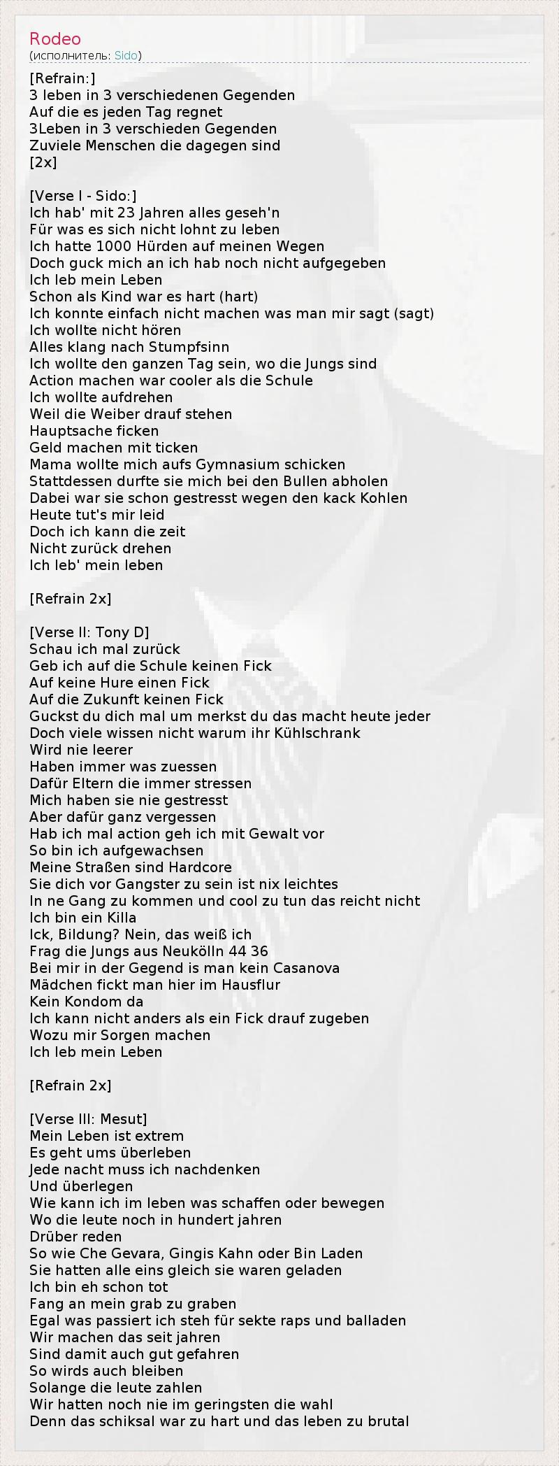 Это интересно:Sido родился 30 Ноября 1980 года в Берлине, настоящее имя Paul Wurdig. В 2001-2009 входил в немецкий лейбл Aggro Berlin.Sido отличается необычными агрессивными и провокационными текстами, но несмотря на это имеет лаконичный оттенок в голосе.Долгое время Sido вообще не снимал маску чтобы скрыть своё истинное лицо. Теперь он носит ее только как собственную визитную карточку.Sido рос с матерью и младшей... продолжение