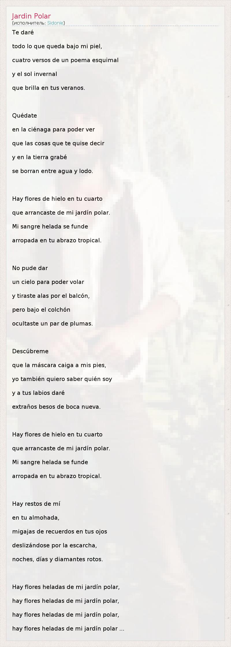 Te daré todo lo que queda bajo mi piel, cuatro versos de un poema esquimal y el sol invernal que brilla en tus veranos. Quédate en la ciénaga para poder ver que las cosas que te quise decir y en la tierra grabé se borran entre agua y lodo. Hay flores de hielo en tu cuarto que arrancaste de mi jardín polar. Mi sangre helada se funde arropada en tu abrazo tropical. No pude dar un cielo para poder volar y tiraste alas por el balcón, pero bajo el colchón ocultaste un par de plumas. Descúbreme que la máscara caiga a mis pies, yo también quiero saber quién soy y a tus labios daré extraños besos de boca nueva. Hay flores de hielo en tu cuarto que arrancaste de mi jardín polar. Mi sangre helada se funde arropada en tu abrazo tropical. Hay restos de mí en tu almohada, migajas de recuerdos en tus ojos deslizándose por la escarcha, noches, días y diamantes rotos. Hay flores heladas de mi jardín polar, hay flores heladas de mi jardín polar, hay flores heladas de mi jardín polar, hay flores heladas de mi jardín polar ...