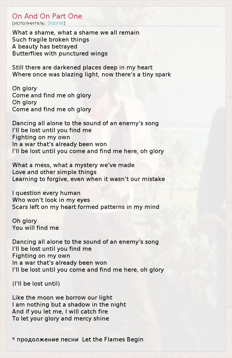What a shame, what a shame we all remain Such fragile broken things A beauty has betrayed Butterflies with punctured wings Still there are darkened places deep in my heart Where once was blazing light, now there's a tiny spark Oh glory Come and find me oh glory Oh glory Come and find me oh glory Dancing all alone to the sound of an enemy's song I'll be lost until you find me Fighting on my own In a war that's already been won I'll be lost until you come and find me here, oh glory What a mess, what a mystery we've made Love and other simple things Learning to forgive, even when it wasn't our mistake I question every human Who won't look in my eyes Scars left on my heart formed patterns in my mind Oh glory You will find me Dancing all alone to the sound of an enemy's song I'll be lost until you find me Fighting on my own In a war that's already been won I'll be lost until you come and find me here, oh glory (I'll be lost until) Like the moon we borrow our light I am nothing but a shadow in the night And if you let me, I will catch fire To let your glory and mercy shine * продолжение песни Let the Flames Begin