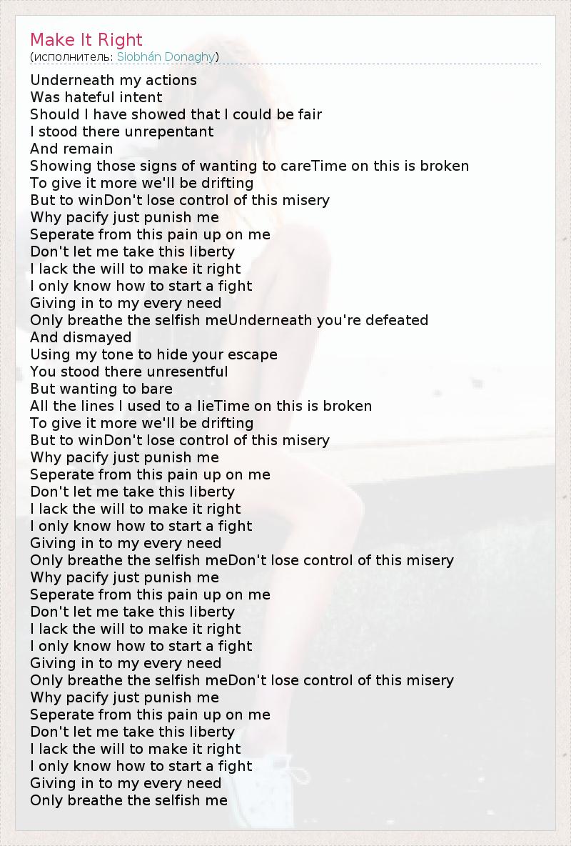 Underneath my actions Was hateful intent Should I have showed that I could be fair I stood there unrepentant And remain Showing those signs of wanting to careTime on this is broken To give it more we'll be drifting But to winDon't lose control of this misery Why pacify just punish me Seperate from this pain up on me Don't let me take this liberty I lack the will to make it right I only know how to start a fight Giving in to my every need Only breathe the selfish meUnderneath you're defeated And dismayed Using my tone to hide your escape You stood there unresentful But wanting to bare All the lines I used to a lieTime on this is broken To give it more we'll be drifting But to winDon't lose control of this misery Why pacify just punish me Seperate from this pain up on me Don't let me take this liberty I lack the will to make it right I only know how to start a fight Giving in to my every need Only breathe the selfish meDon't lose control of this misery Why pacify just punish me Seperate from this pain up on me Don't let me take this liberty I lack the will to make it right I only know how to start a fight Giving in to my every need Only breathe the selfish meDon't lose control of this misery Why pacify just punish me Seperate from this pain up on me Don't let me take this liberty I lack the will to make it right I only know how to start a fight Giving in to my every need Only breathe the selfish me