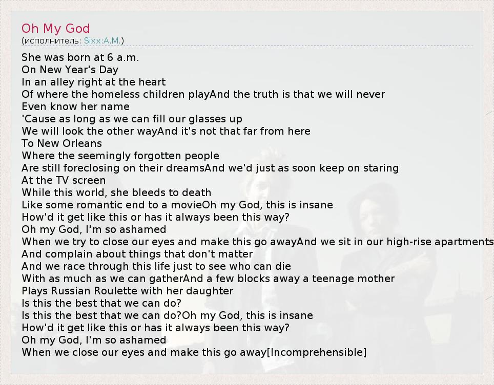 She was born at 6 a.m. On New Year's Day In an alley right at the heart Of where the homeless children playAnd the truth is that we will never Even know her name 'Cause as long as we can fill our glasses up We will look the other wayAnd it's not that far from here To New Orleans Where the seemingly forgotten people Are still foreclosing on their dreamsAnd we'd just as soon keep on staring At the TV screen While this world, she bleeds to death Like some romantic end to a movieOh my God, this is insane How'd it get like this or has it always been this way? Oh my God, I'm so ashamed When we try to close our eyes and make this go awayAnd we sit in our high-rise apartments And complain about things that don't matter And we race through this life just to see who can die With as much as we can gatherAnd a few blocks away a teenage mother Plays Russian Roulette with her daughter Is this the best that we can do? Is this the best that we can do?Oh my God, this is insane How'd it get like this or has it always been this way? Oh my God, I'm so ashamed When we close our eyes and make this go away[Incomprehensible]