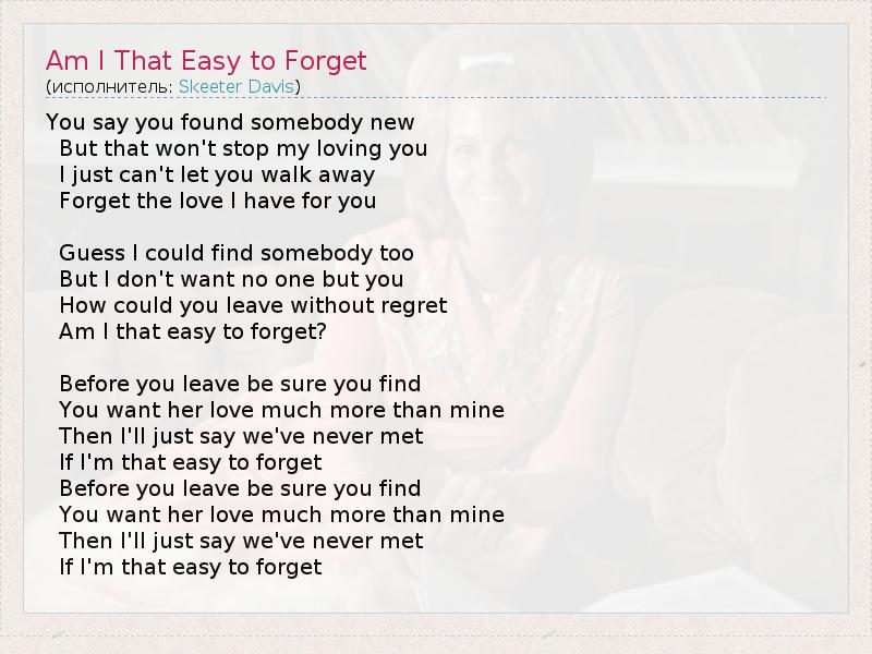 А как ты думаешь, о чем песня "Am I That Easy to Forget" ?