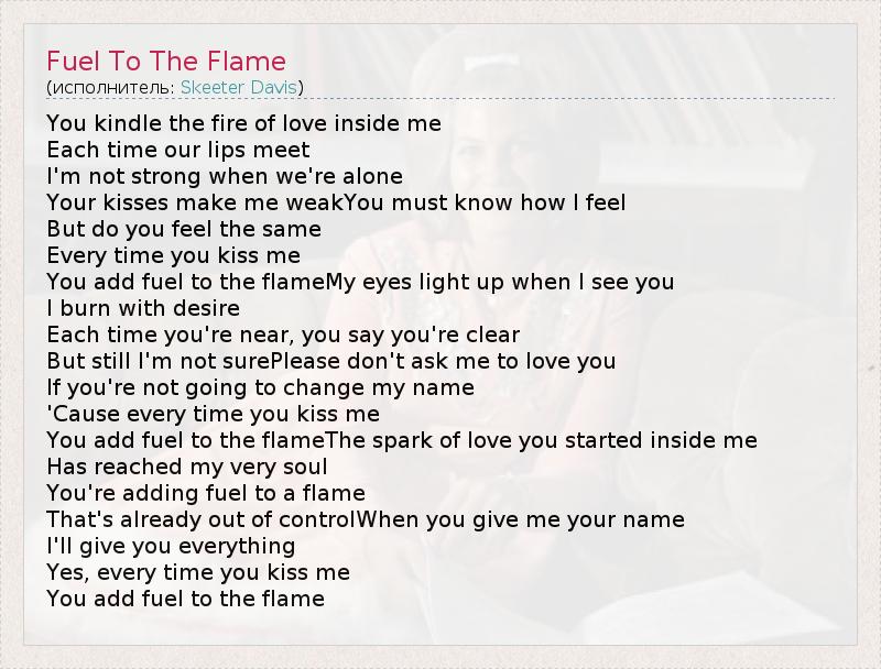 You kindle the fire of love inside me Each time our lips meet I'm not strong when we're alone Your kisses make me weakYou must know how I feel But do you feel the same Every time you kiss me You add fuel to the flameMy eyes light up when I see you I burn with desire Each time you're near, you say you're clear But still I'm not surePlease don't ask me to love you If you're not going to change my name 'Cause every time you kiss me You add fuel to the flameThe spark of love you started inside me Has reached my very soul You're adding fuel to a flame That's already out of controlWhen you give me your name I'll give you everything Yes, every time you kiss me You add fuel to the flame