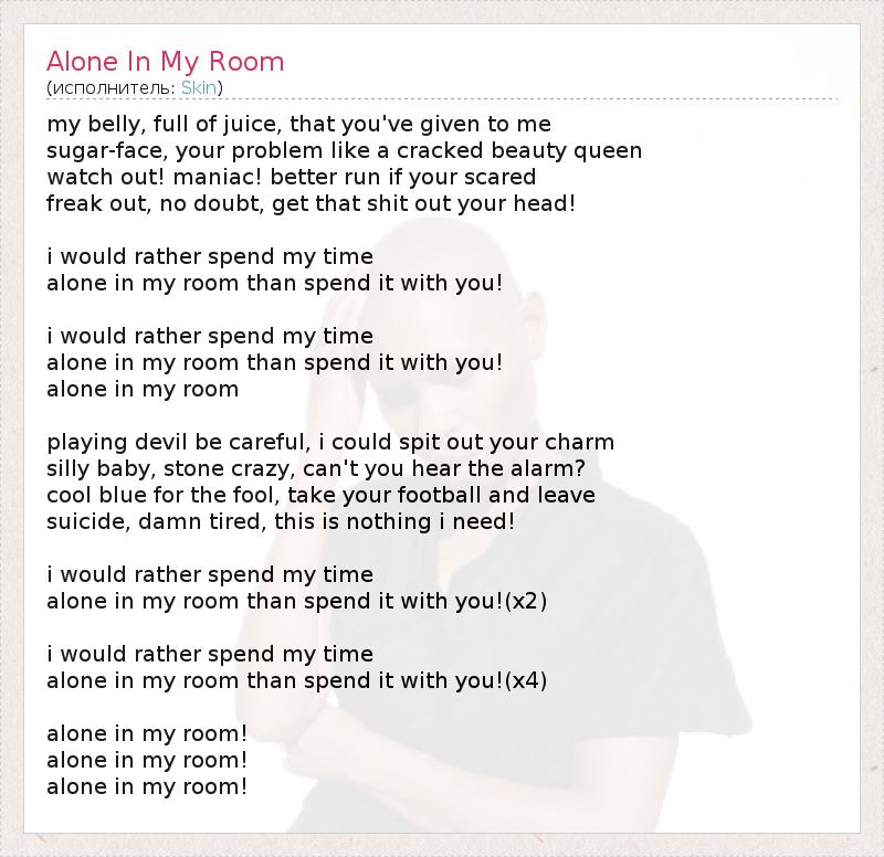 my belly, full of juice, that you've given to me sugar-face, your problem like a cracked beauty queen watch out! maniac! better run if your scared freak out, no doubt, get that shit out your head! i would rather spend my time alone in my room than spend it with you! i would rather spend my time alone in my room than spend it with you! alone in my room playing devil be careful, i could spit out your charm silly baby, stone crazy, can't you hear the alarm? cool blue for the fool, take your football and leave suicide, damn tired, this is nothing i need! i would rather spend my time alone in my room than spend it with you!(x2) i would rather spend my time alone in my room than spend it with you!(x4) alone in my room! alone in my room! alone in my room!