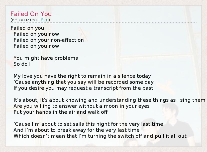 Failed on you Failed on you now Failed on your non-affection Failed on you now You might have problems So do I My love you have the right to remain in a silence today 'Cause anything that you say will be recorded some day If you desire you may request a transcript from the past It's about, it's about knowing and understanding these things as I sing them Are you willing to answer without a moon in your eyes Put your hands in the air and walk off 'Cause I'm about to set sails this night for the very last time And I'm about to break away for the very last time Which doesn't mean that I'm turning the switch off and pull it all out