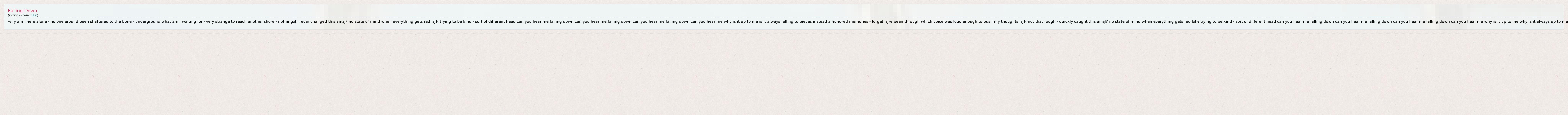 why am I here alone - no one around been shattered to the bone - underground what am I waiting for - very strange to reach another shore - nothingзЈ— ever changed this ainзЈ? no state of mind when everything gets red IзЈЋ trying to be kind - sort of different head can you hear me falling down can you hear me falling down can you hear me falling down can you hear me why is it up to me is it always falling to pieces instead a hundred memories - forget IзЈ›e been through which voice was loud enough to push my thoughts IзЈЋ not that rough - quickly caught this ainзЈ? no state of mind when everything gets red IзЈЋ trying to be kind - sort of different head can you hear me falling down can you hear me falling down can you hear me falling down can you hear me why is it up to me why is it always up to me