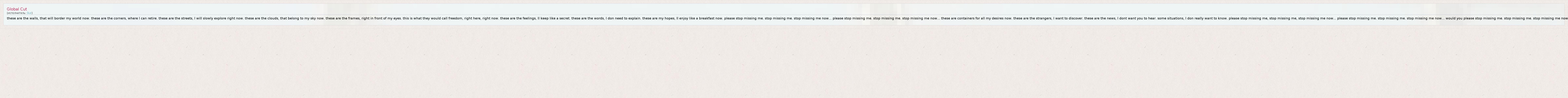 these are the walls, that will border my world now. these are the corners, where I can retire. these are the streets, I will slowly explore right now. these are the clouds, that belong to my sky now. these are the frames, right in front of my eyes. this is what they would call freedom, right here, right now. these are the feelings, Il keep like a secret. these are the words, I don need to explain. these are my hopes, Il enjoy like a breakfast now. please stop missing me. stop missing me. stop missing me now... please stop missing me. stop missing me. stop missing me now... these are containers for all my desires now. these are the strangers, I want to discover. these are the news, I dont want you to hear. some situations, I don really want to know. please stop missing me, stop missing me, stop missing me now... please stop missing me. stop missing me. stop missing me now... would you please stop missing me. stop missing me. stop missing me now