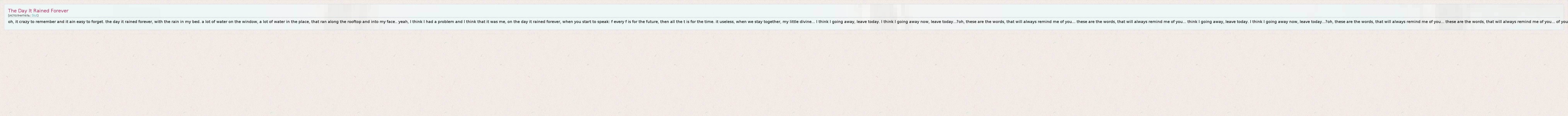 oh, it crazy to remember and it ain easy to forget. the day it rained forever, with the rain in my bed. a lot of water on the window, a lot of water in the place, that ran along the rooftop and into my face.. yeah, I think I had a problem and I think that it was me, on the day it rained forever, when you start to speak: f every f is for the future, then all the t is for the time. it useless, when we stay together, my little divine... I think I going away, leave today. I think I going away now, leave today...?oh, these are the words, that will always remind me of you... these are the words, that will always remind me of you... think I going away, leave today. I think I going away now, leave today...?oh, these are the words, that will always remind me of you... these are the words, that will always remind me of you... of you
