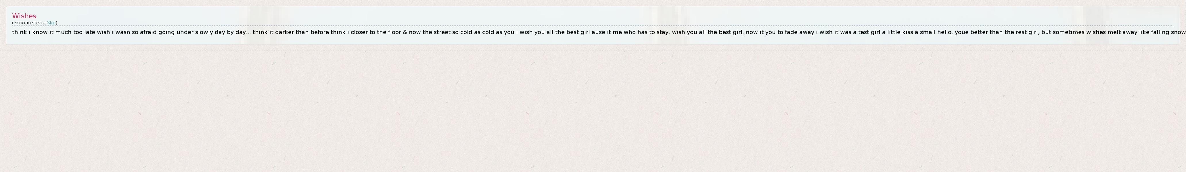 think i know it much too late wish i wasn so afraid going under slowly day by day... think it darker than before think i closer to the floor & now the street so cold as cold as you i wish you all the best girl ause it me who has to stay, wish you all the best girl, now it you to fade away i wish it was a test girl a little kiss a small hello, youe better than the rest girl, but sometimes wishes melt away like falling snow
